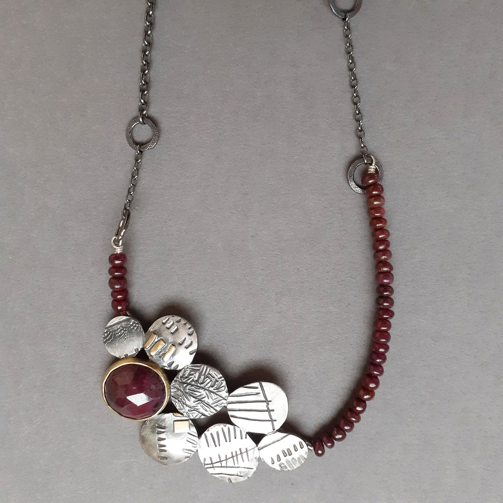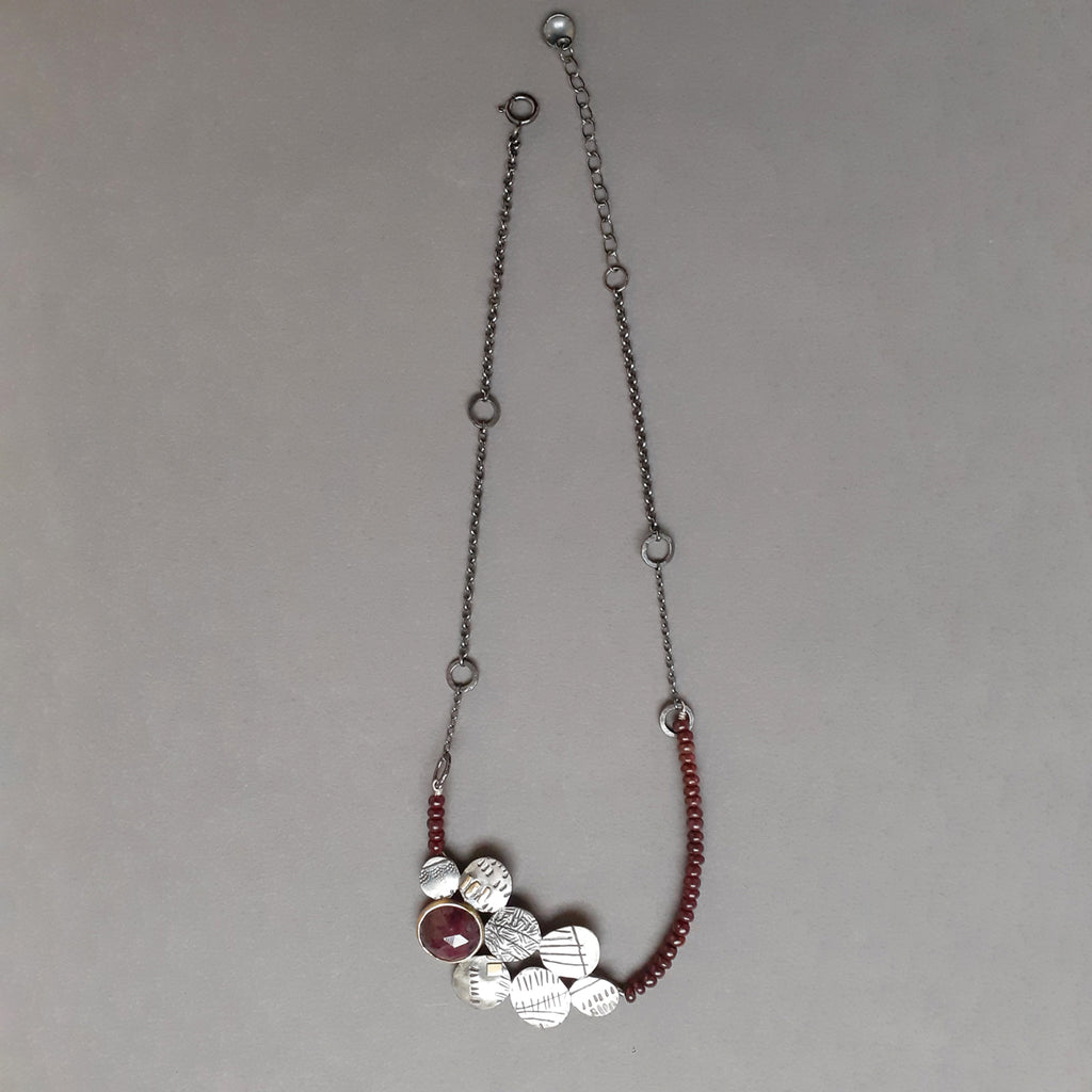 Beautiful necklace made in oxidised silver with Ruby stone, 18ct gold detail and Ruby beads.