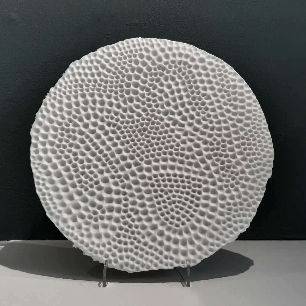 Beaten and planished Bone China wall piece, with clear acrylic fitting for hanging.