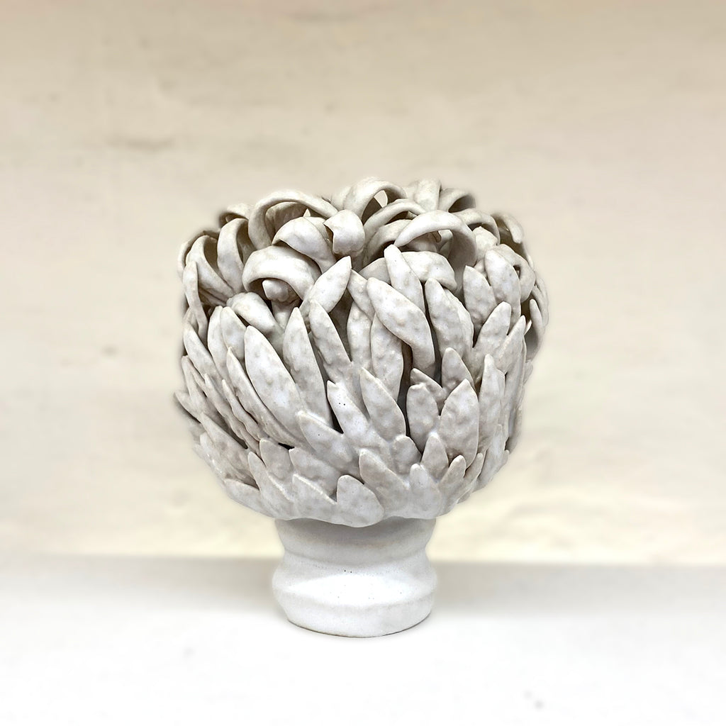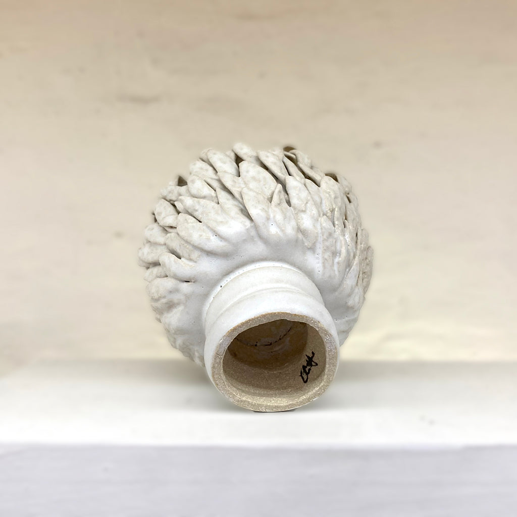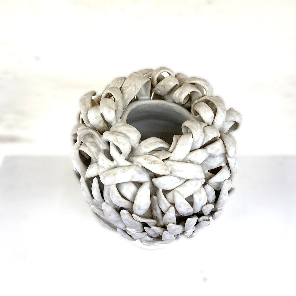 This one-of-a-kind ceramic sculpture blends wheel-thrown and coiled shapes, its surface enriched with delicately applied leaf elements. A serene white matte glaze finishes the piece.