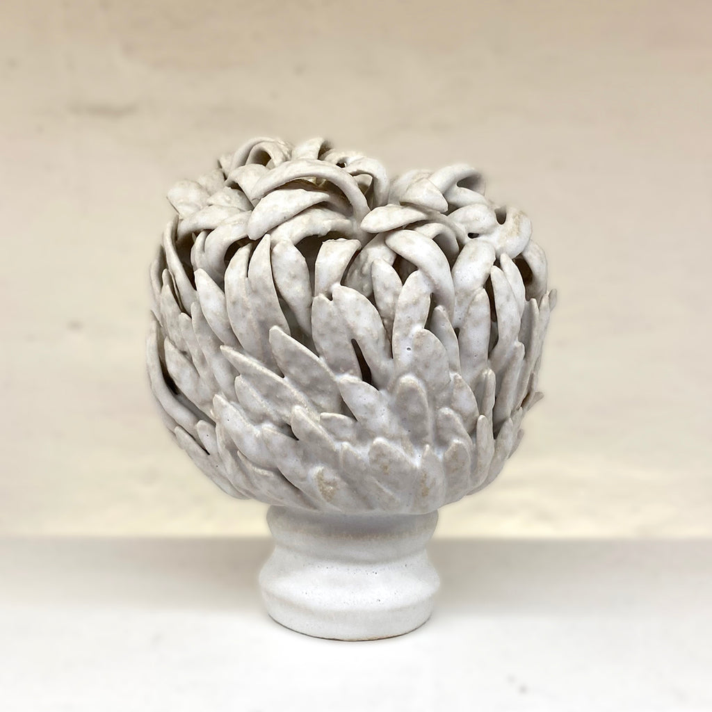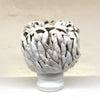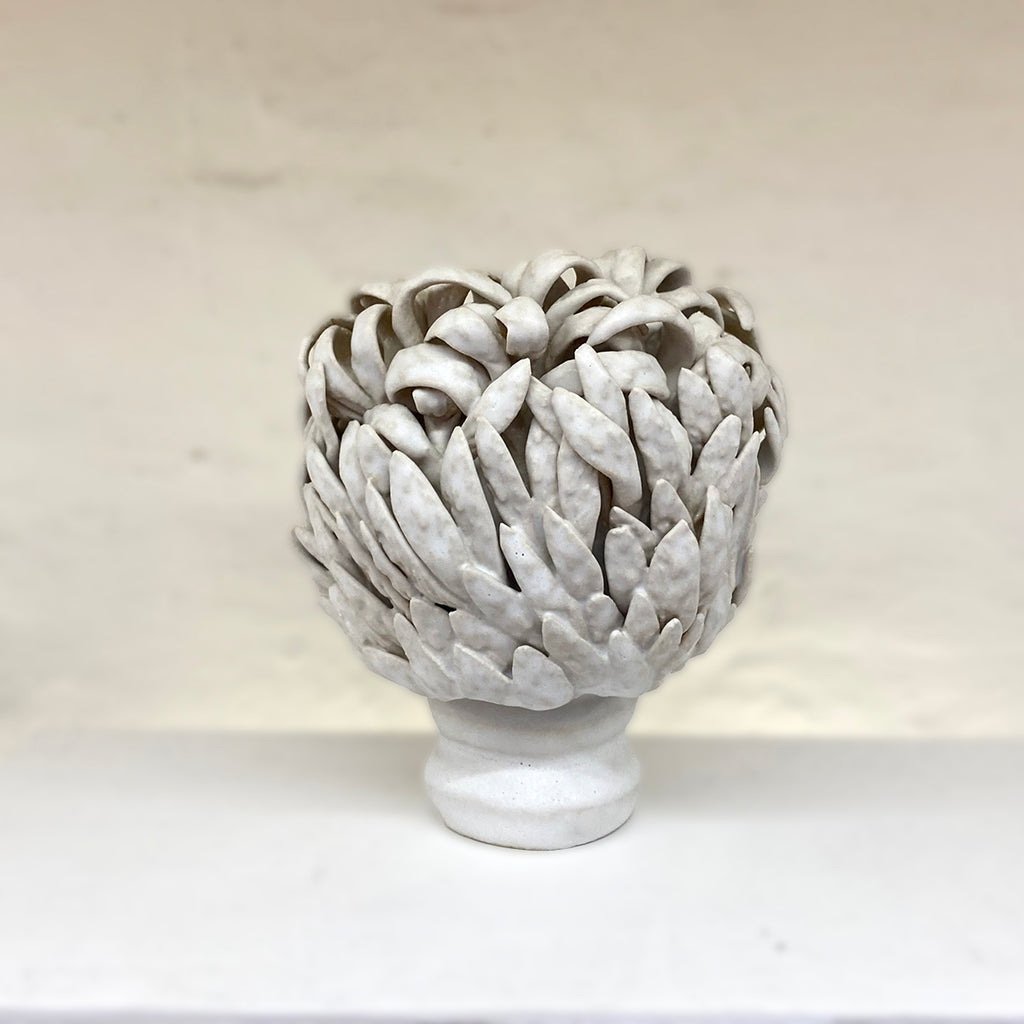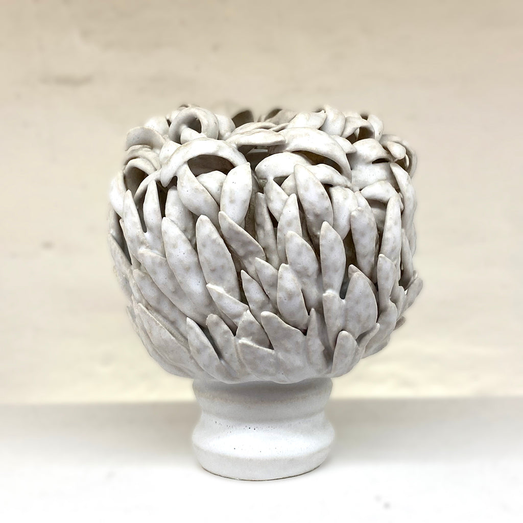 This one-of-a-kind ceramic sculpture blends wheel-thrown and coiled shapes, its surface enriched with delicately applied leaf elements. A serene white matte glaze finishes the piece.
