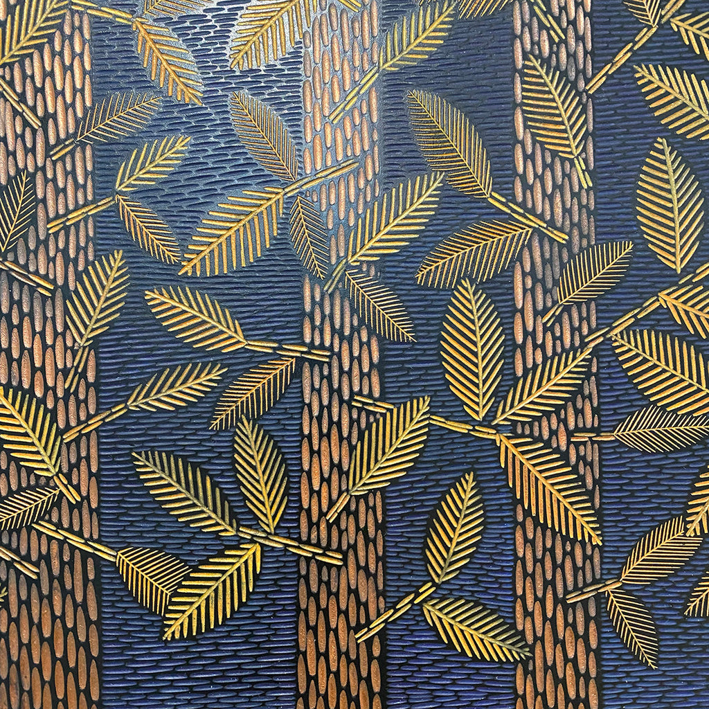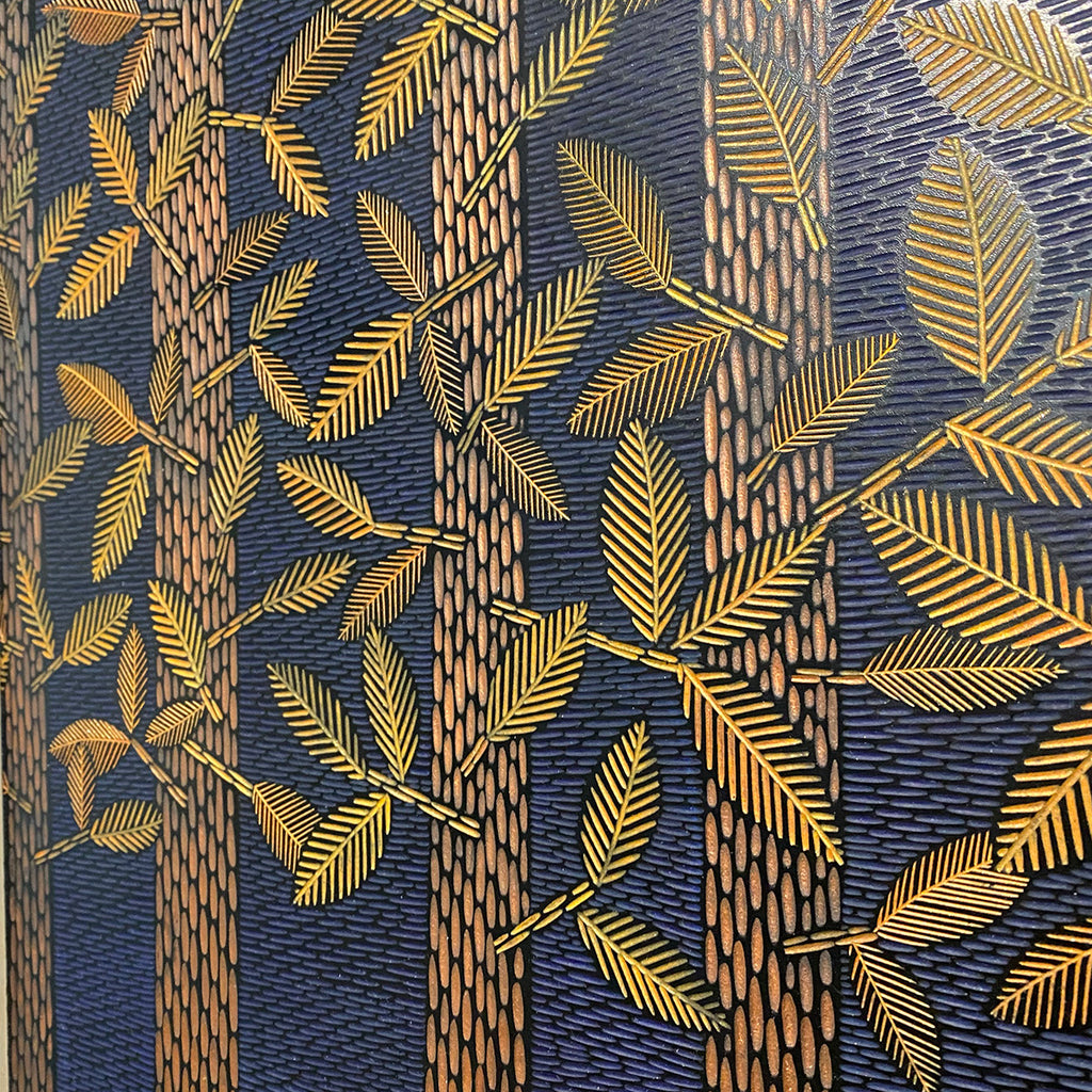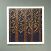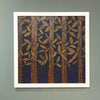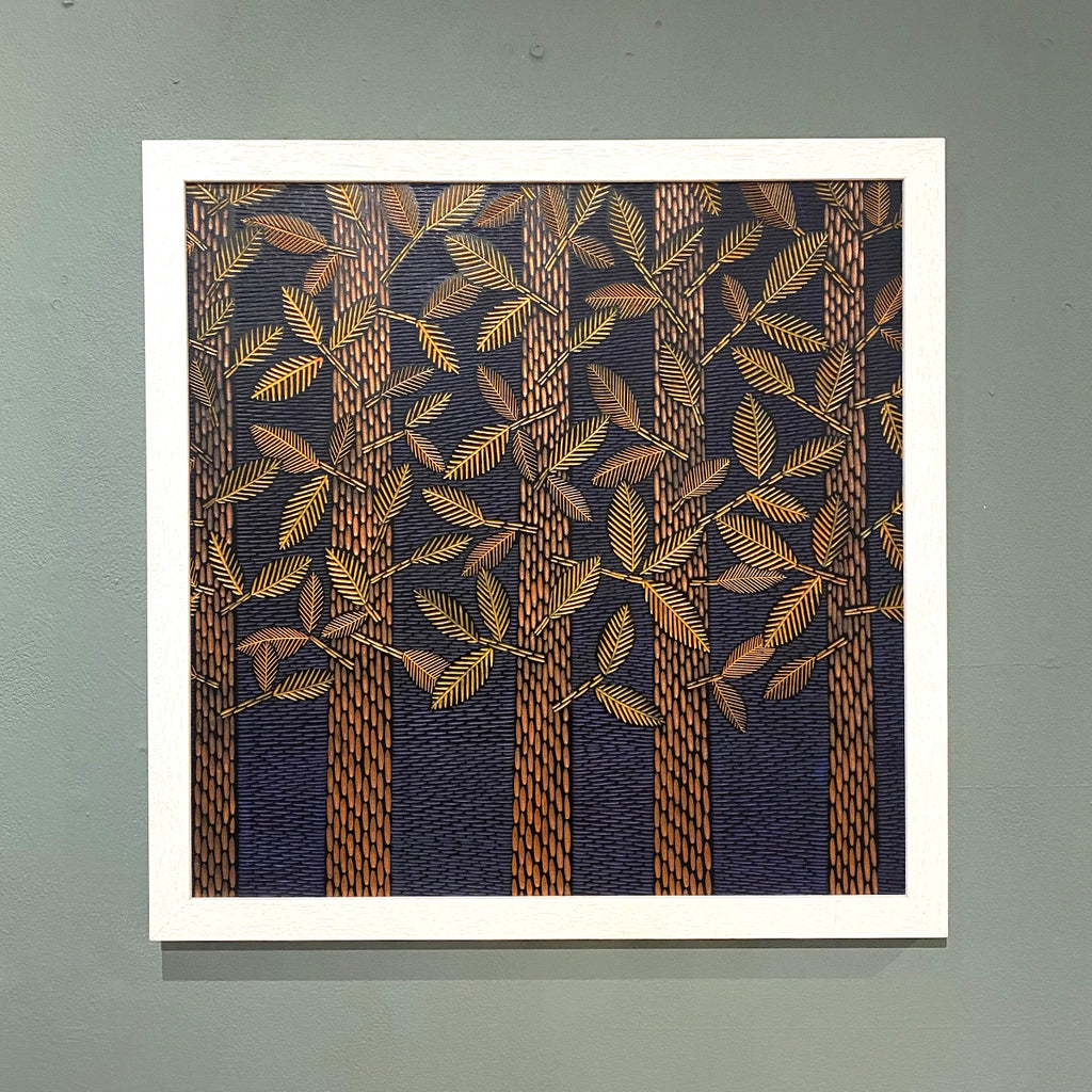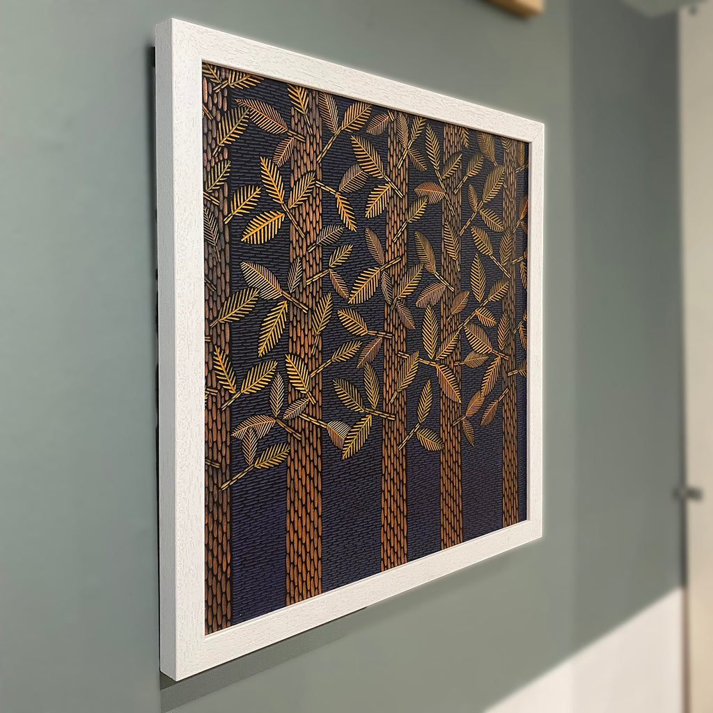A large hand carved and hand painted leather wall panel in navy and brown tones in a white wooden frame. This can be hung on a wall or placed on a shelf. This piece is named 'Autumn'.