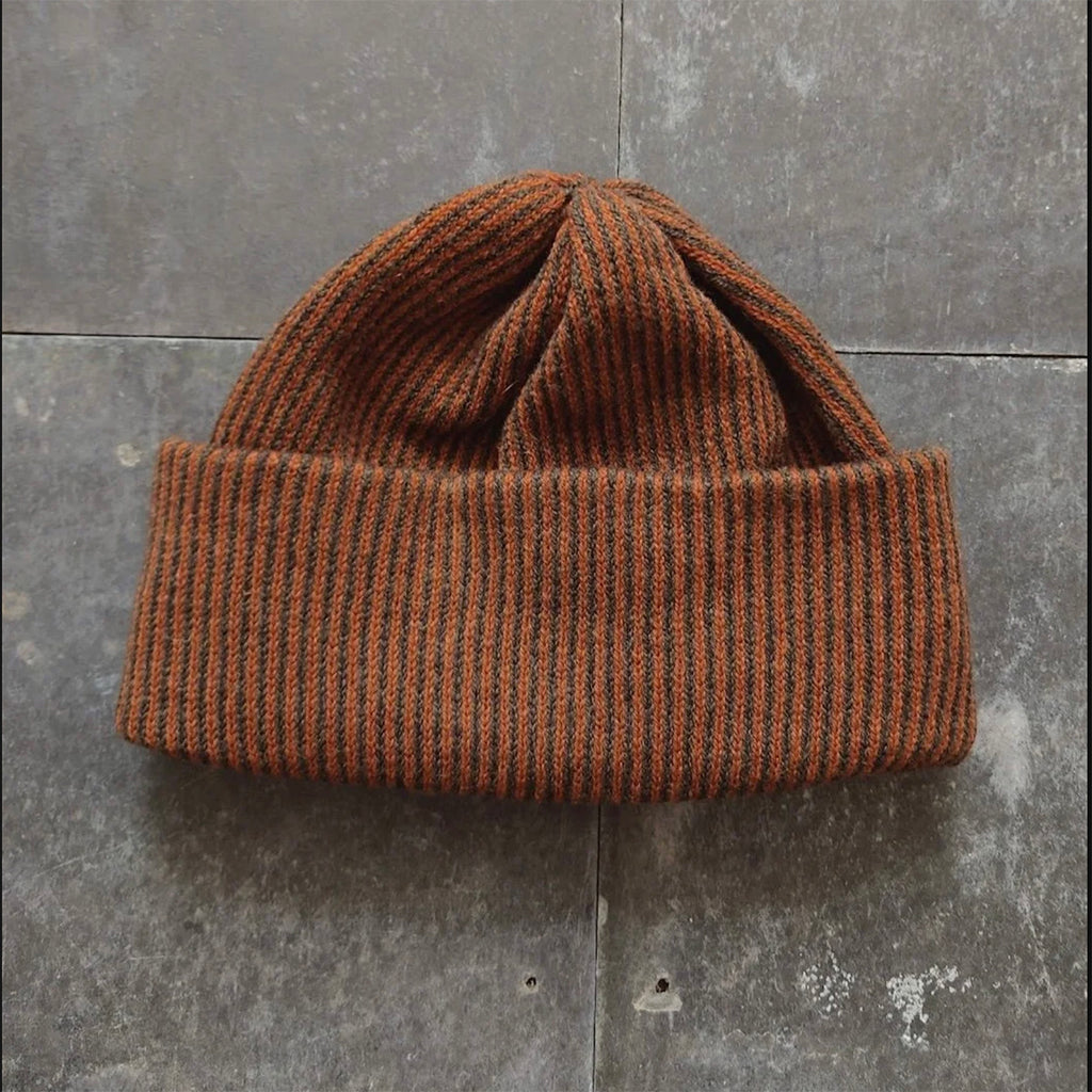 This tactile and cosy hat is knitted in a fine stripe pattern combining shades of chestnut and seaweed.