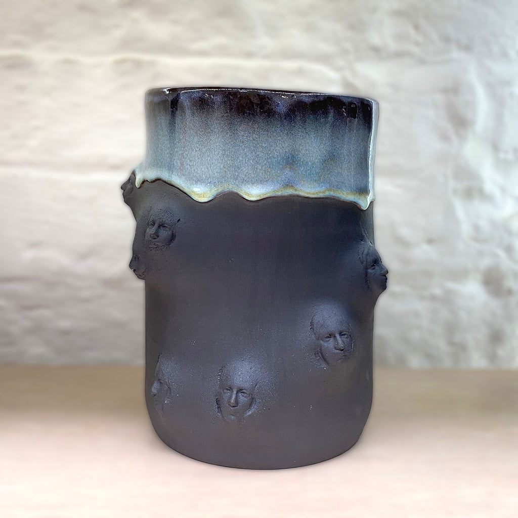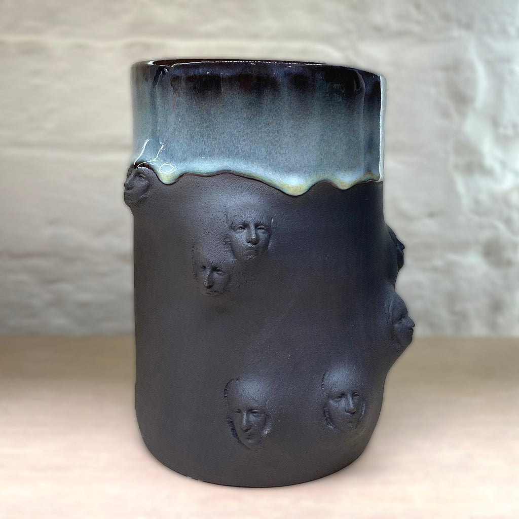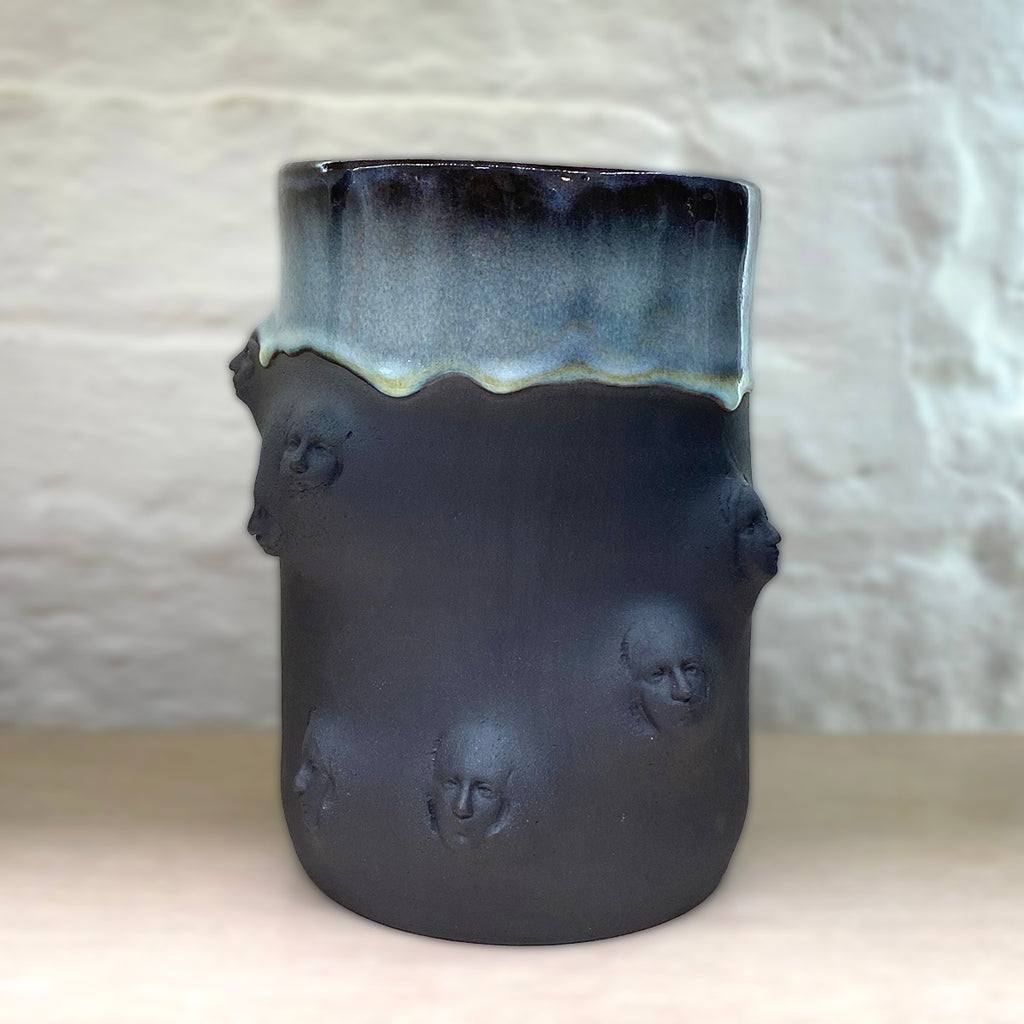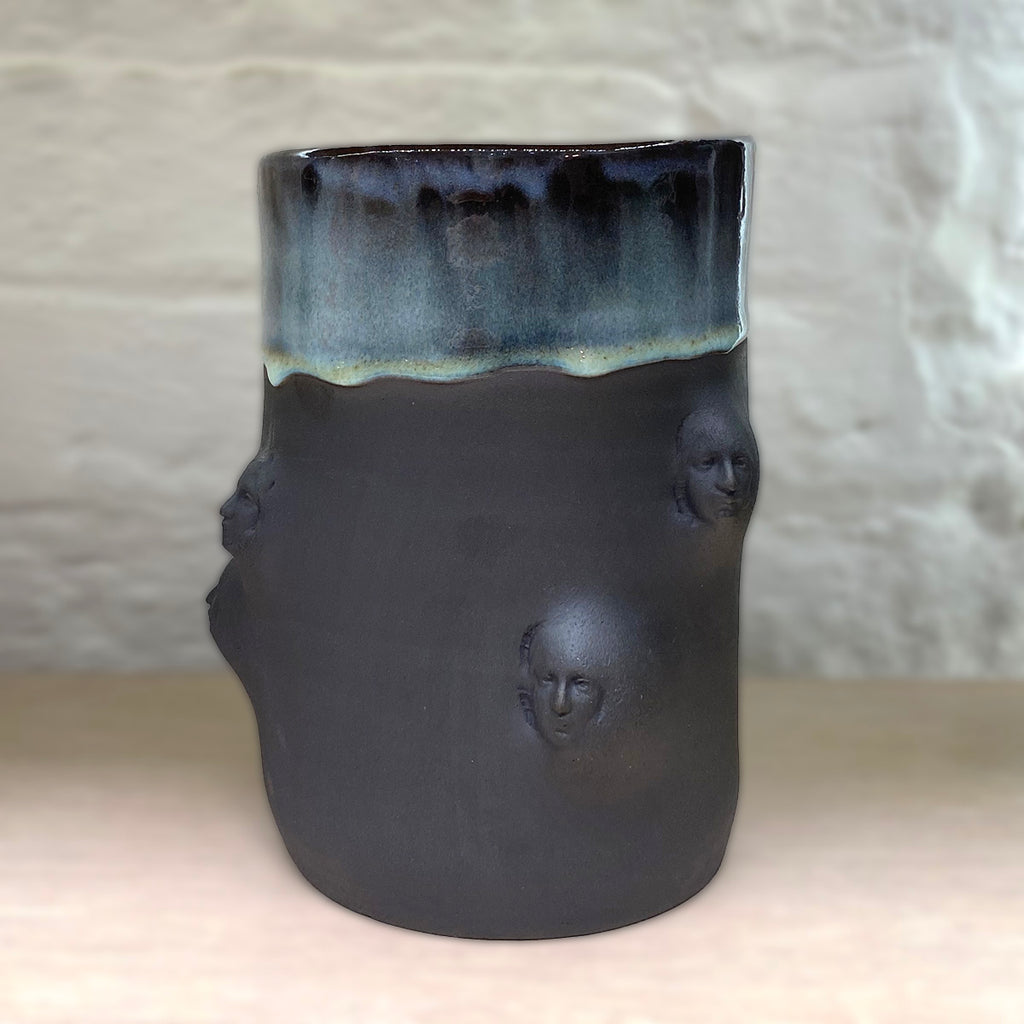 A beautiful Black porcelain Wine Cooler/ Vase with the Madonna's face in 3d relief pushed into the surface with a halo glaze by Anja Lubach.