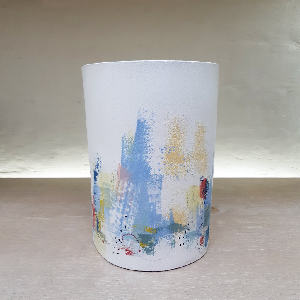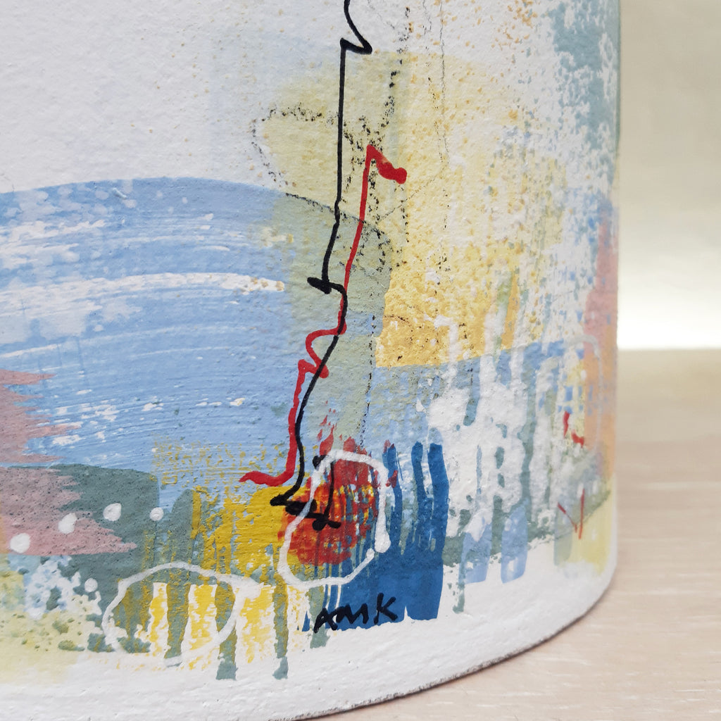 This large slab built and hand decorated ceramic vessel features a bold abstract design, working with the clay surface as a canvas.