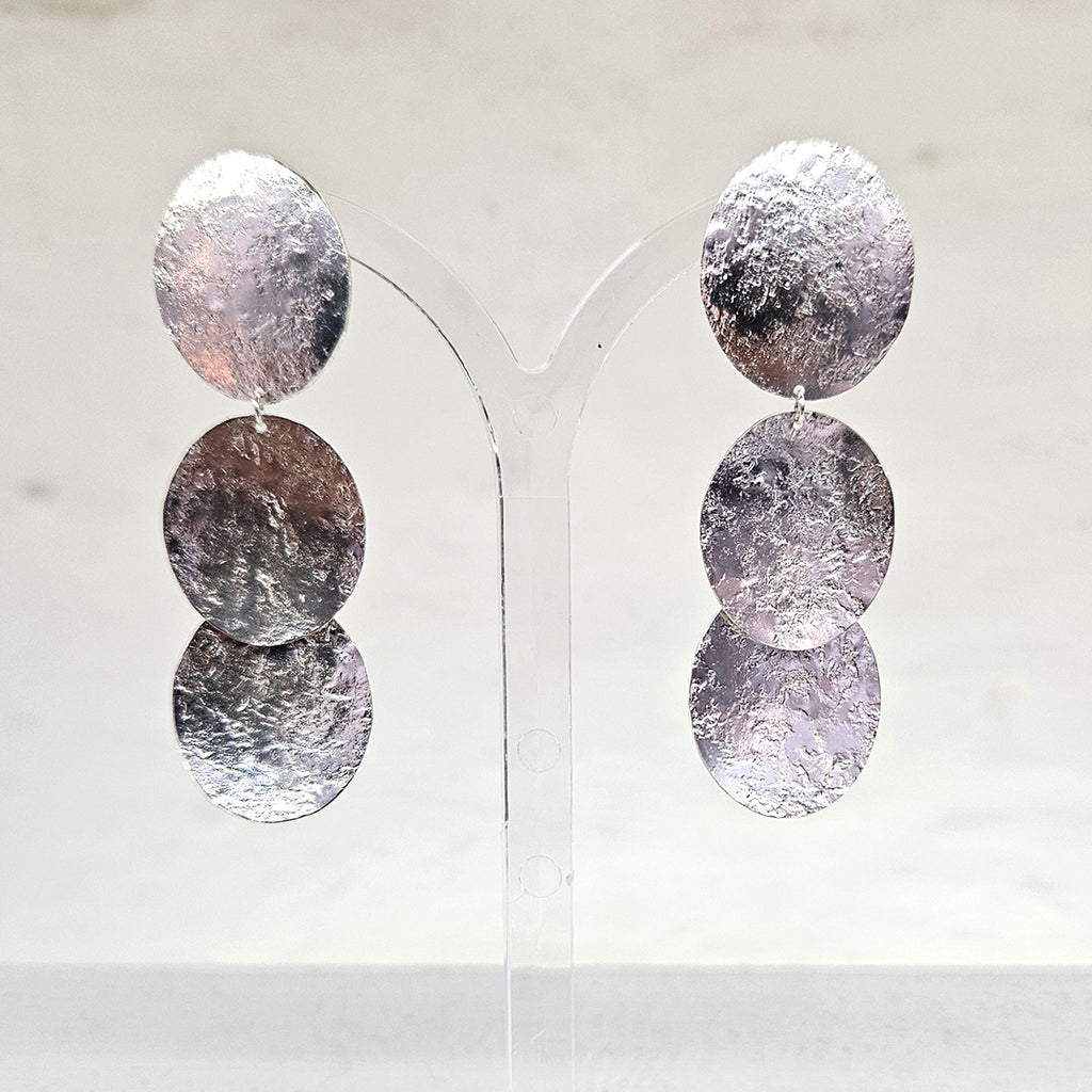 A stunning pair of sterling silver 3 drop pebble oval earrings by Anne Morgan. A beautiful pebble texture printed onto the sterling silver creates a unique feel to these earrings.