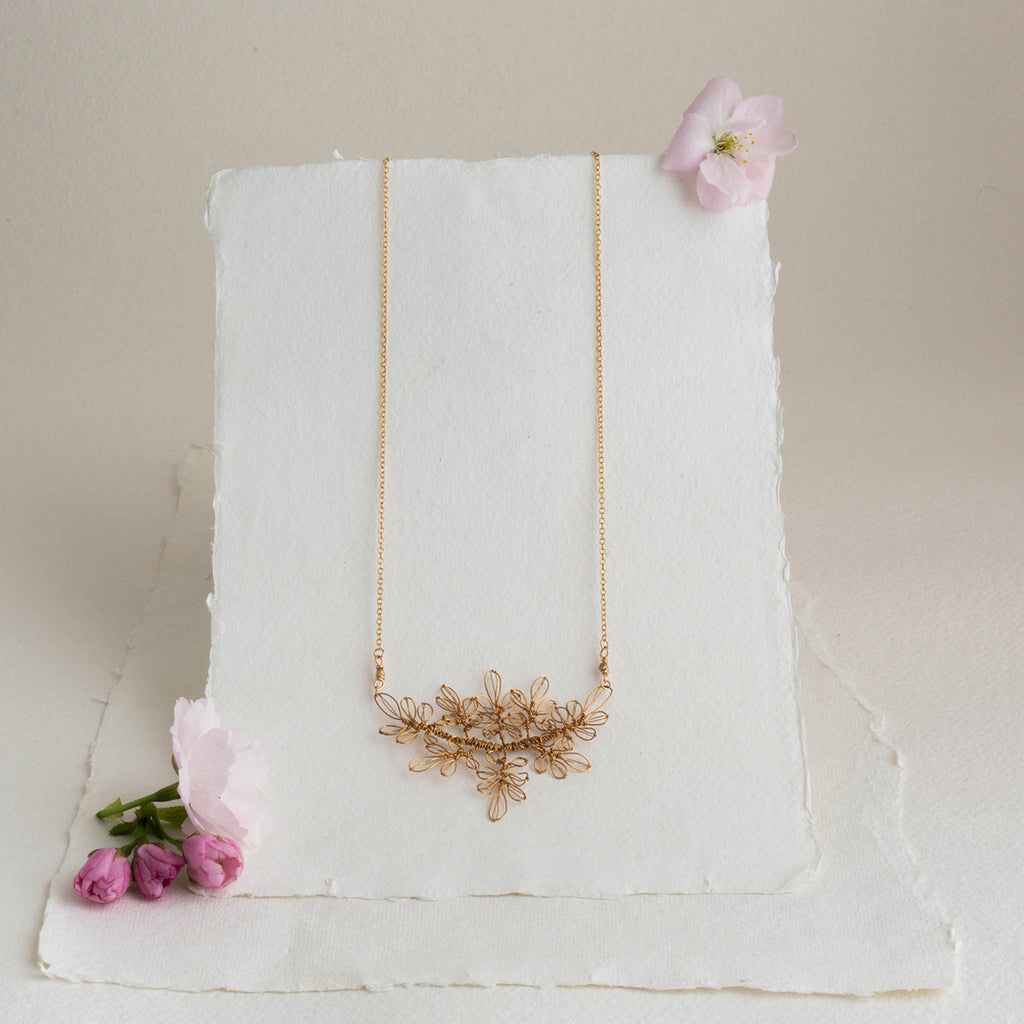 Handmade bridal necklace featuring a garland of rounded leaves. Made from gold plated copper wire with a 14ct gold filled chain.