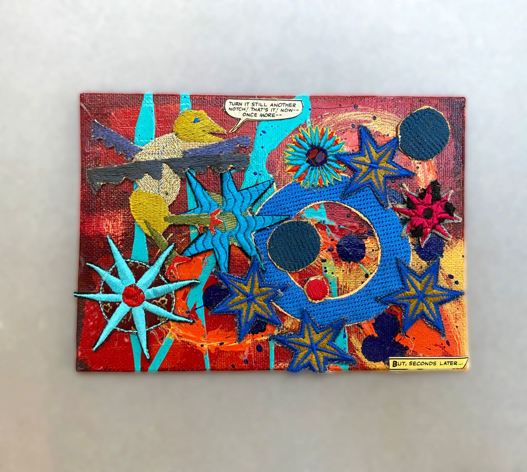 This piece named Seconds Later by Michael Brennand-Wood is a one off postcard. Combining vibrant colours and mixed materials to create a visually stimulating unique piece of artwork.