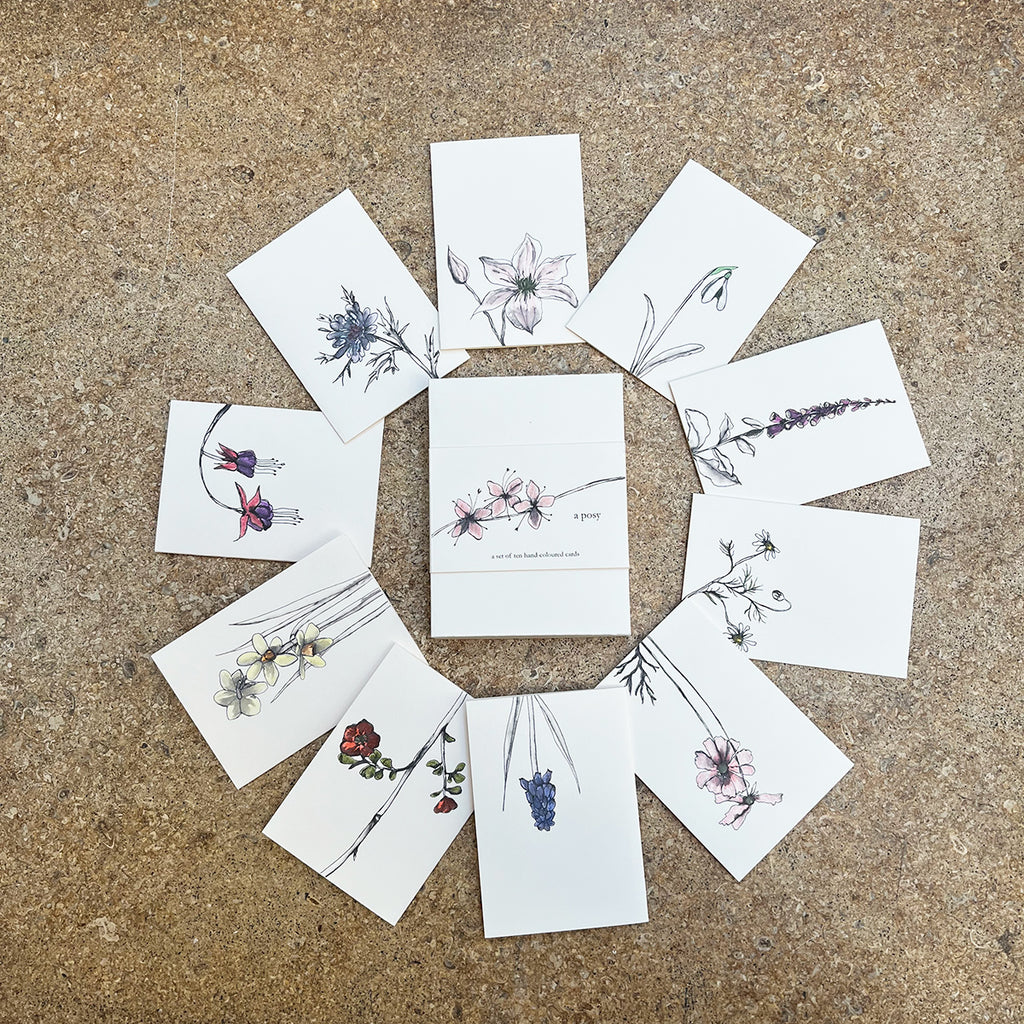 Set of ten hand-coloured 'Posy' cards by Elizabeth Willow