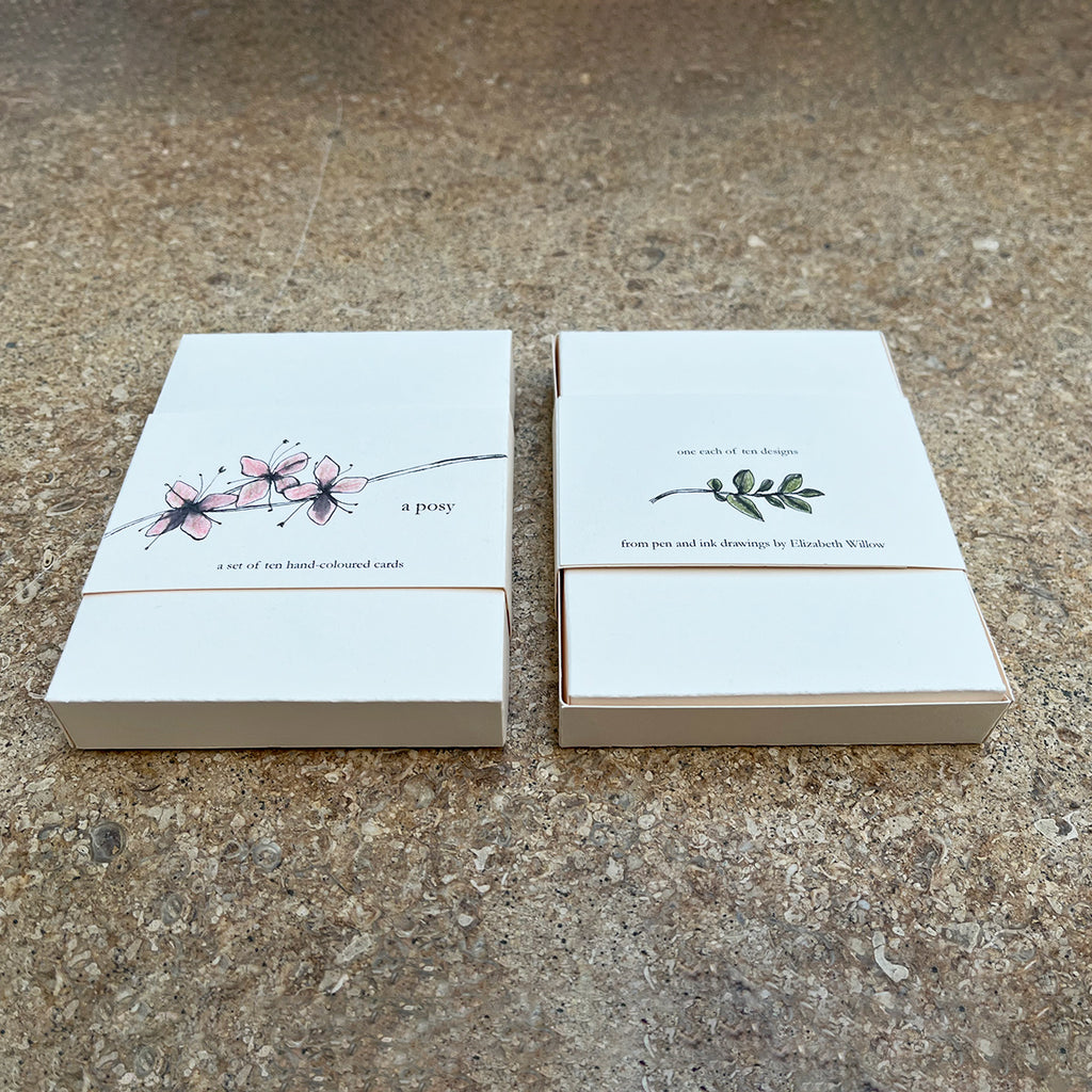 A beautiful set of ten hand-coloured cards, one each of ten designs from pen and ink drawings by Elizabeth Willow.  Blank for your own message with cream coloured envelopes.