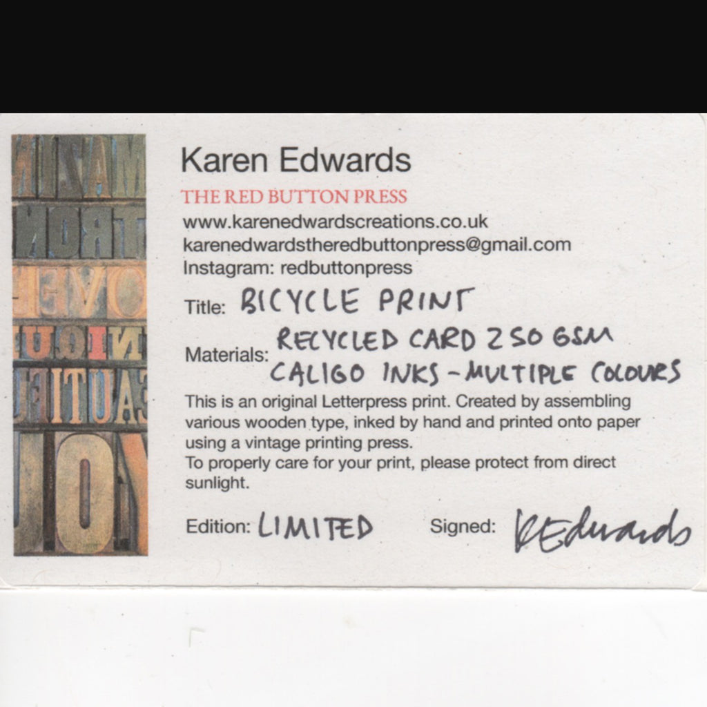 Karen's letterpress items are printed at her workspace within Bridewell Studios and Gallery, Liverpool, using vintage printing blocks together with wooden and metal type on a lovely old printing press called an Adana 8 x 5.