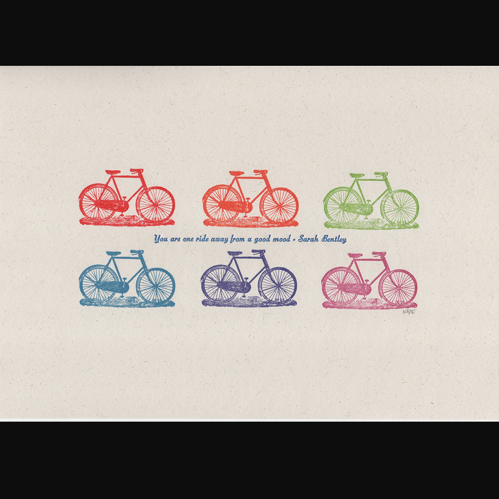 The phrase 'You are one ride away from a good mood' is a quote by British cyclist Sarah Bentley, highlighting the positive impact of cycling on mental well-being.