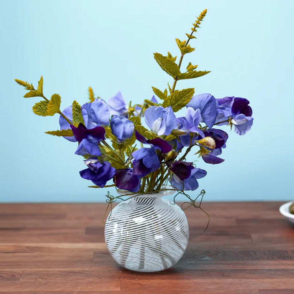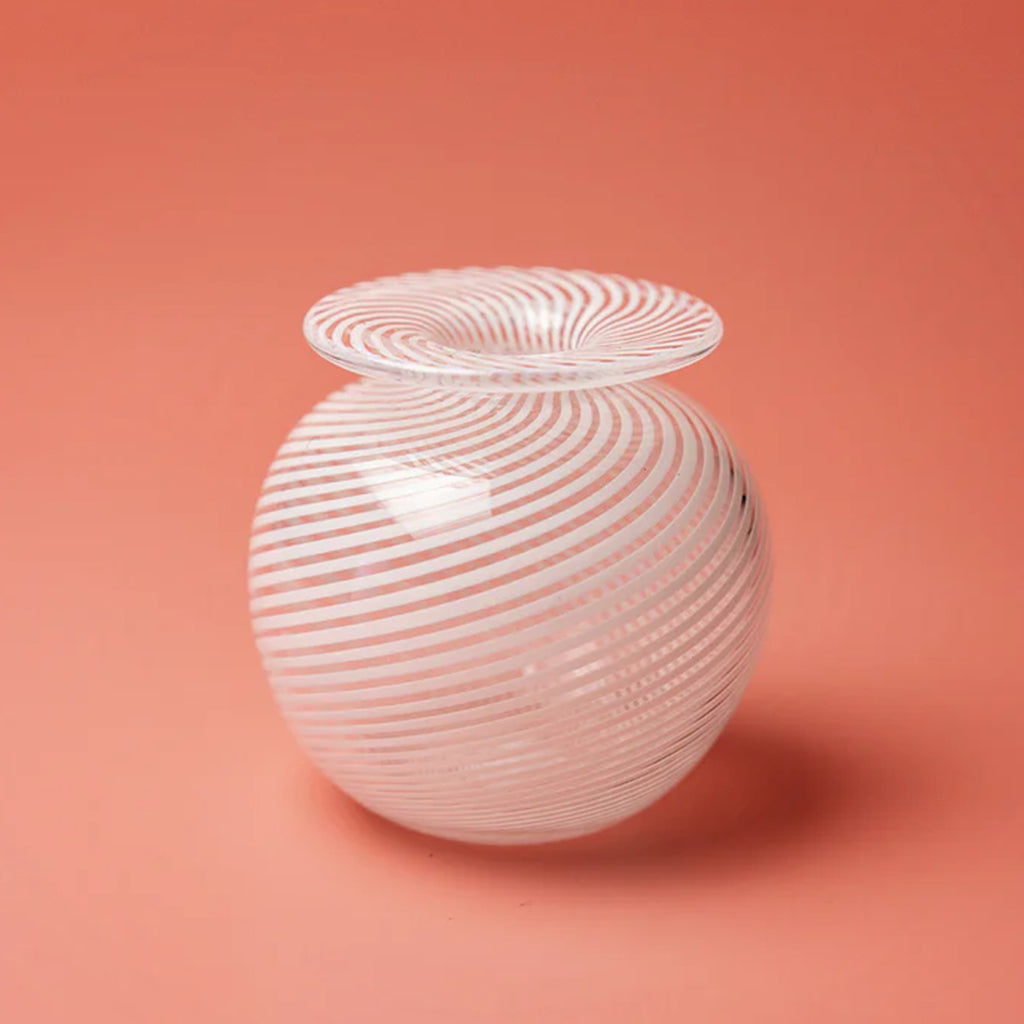 Mixing contemporary with the traditional, this glass vase features the distinctive filigrana style of blown glass with an alternating pattern of clear and white canes, which originated on the island of Murano in the 16th Century.