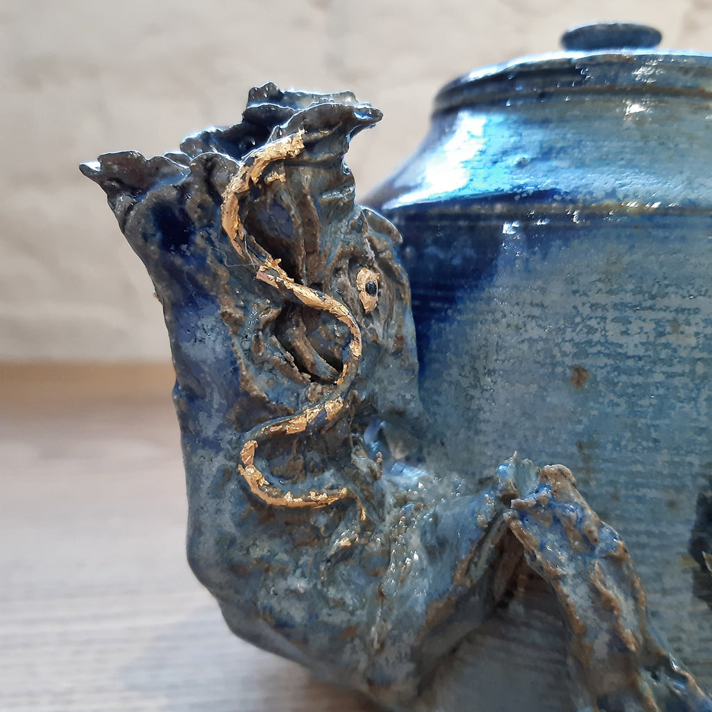 This new collection of work displays a range of ceremonial teapots and a group of smaller vessels referred to as miniatures, all of the pieces are gilded with 24k gold leaf and inlayed with a blue sapphire which is colour specific to the Bluecoat Display Centre.” – Jacob Chan