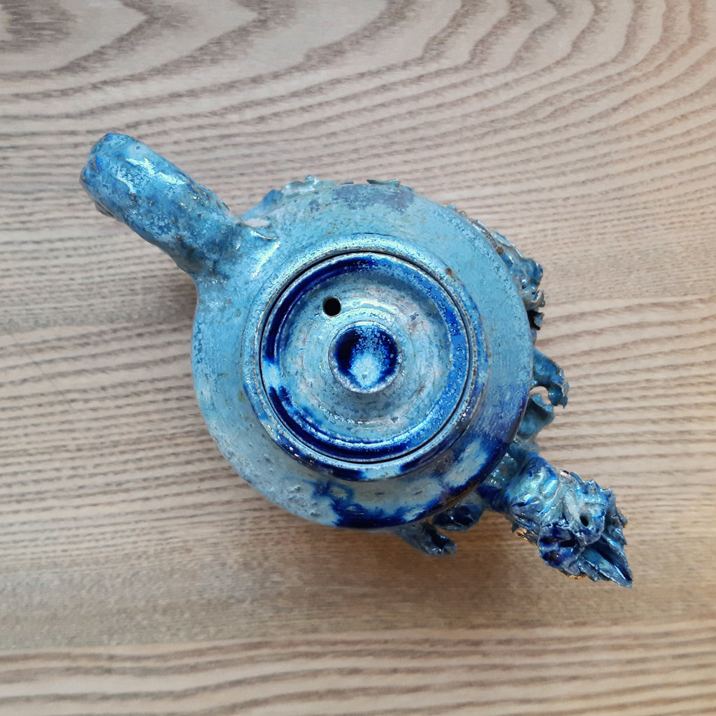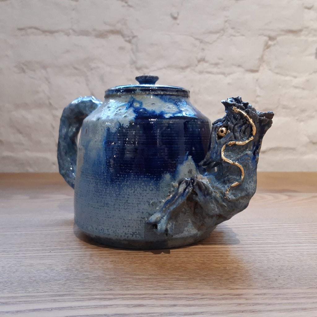 A blue teapot with a wide base and dragon's head spout and curved body handle.