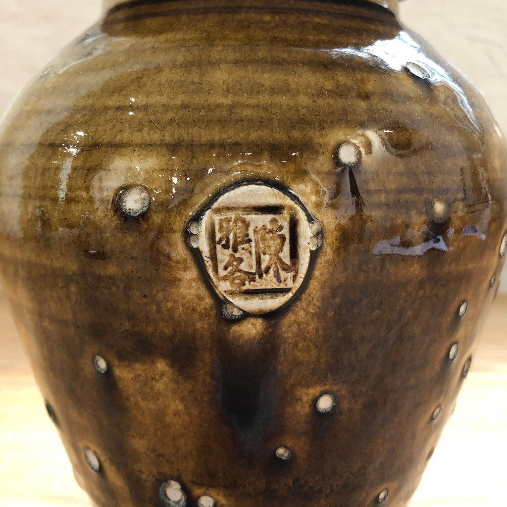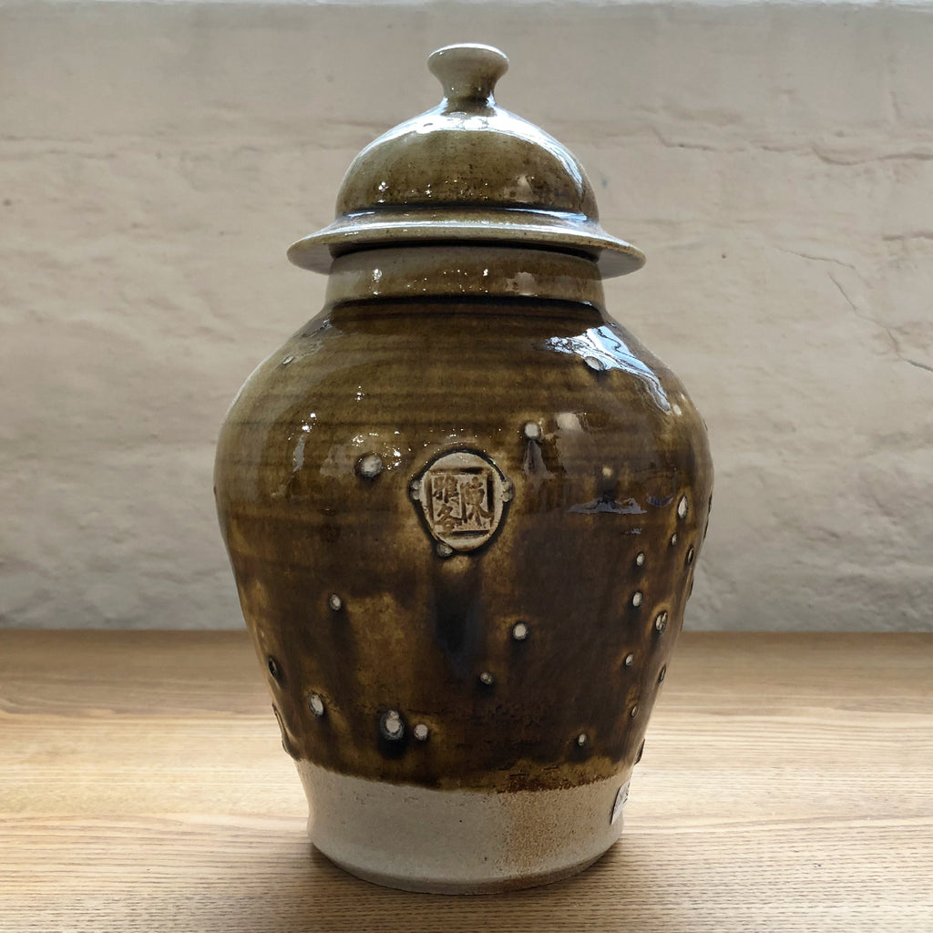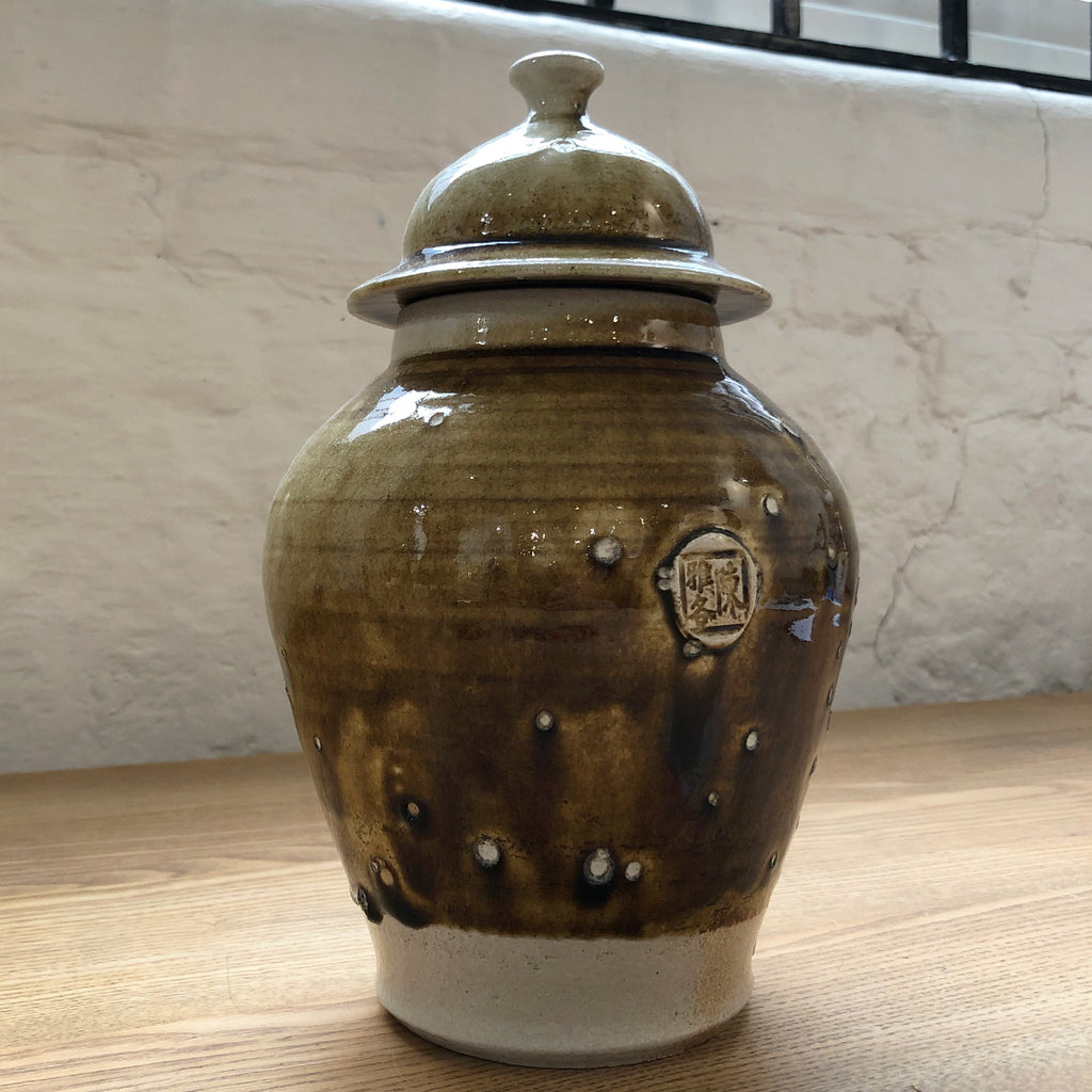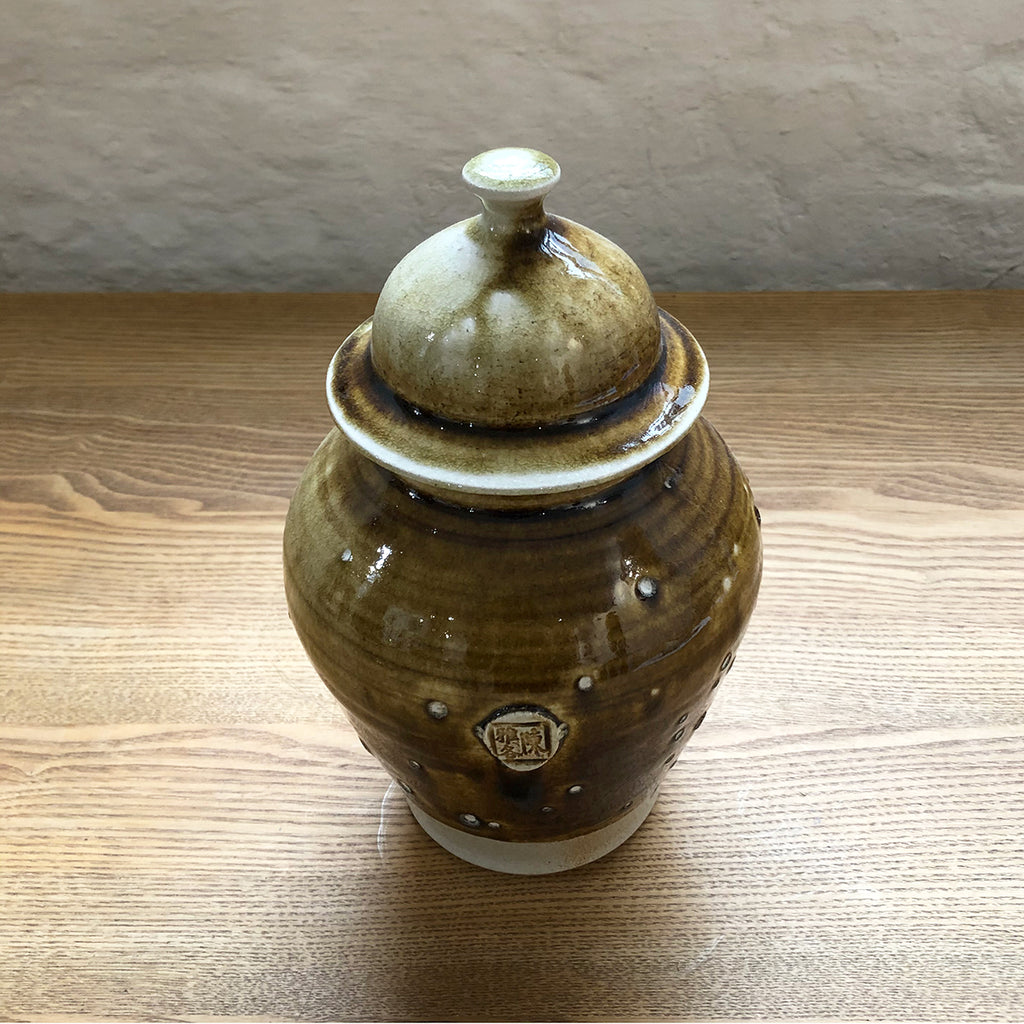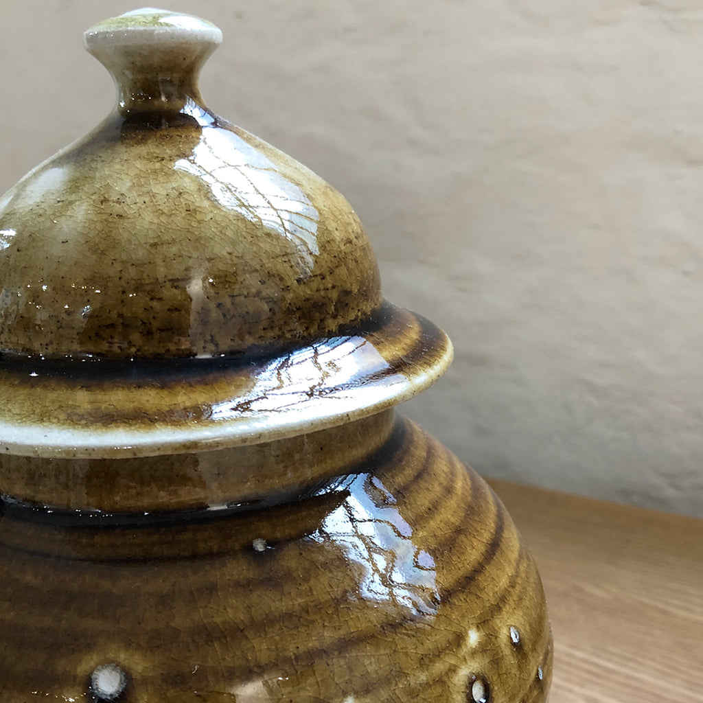 Small ceramic lidded ginger jar in a translucent earth-toned glaze, featuring Jacob's unique maker's stamp.