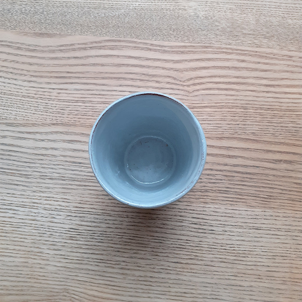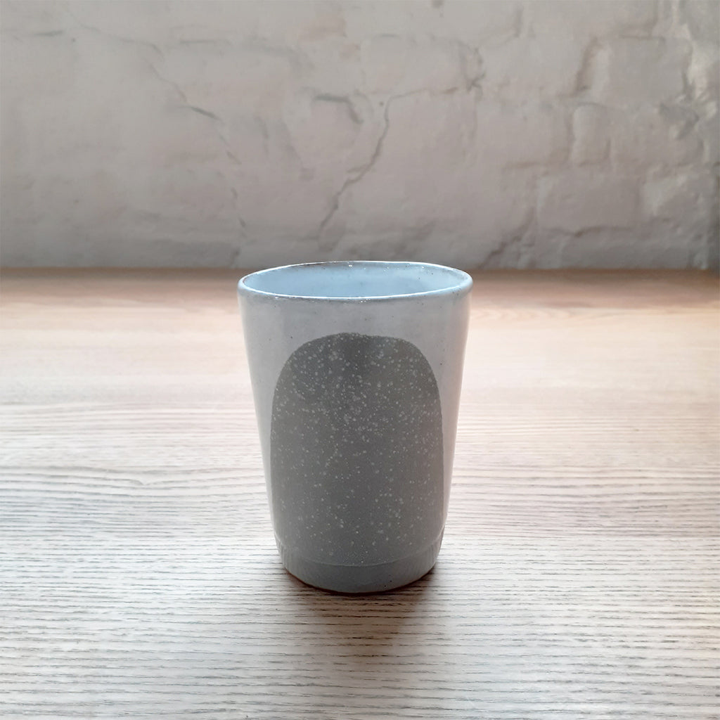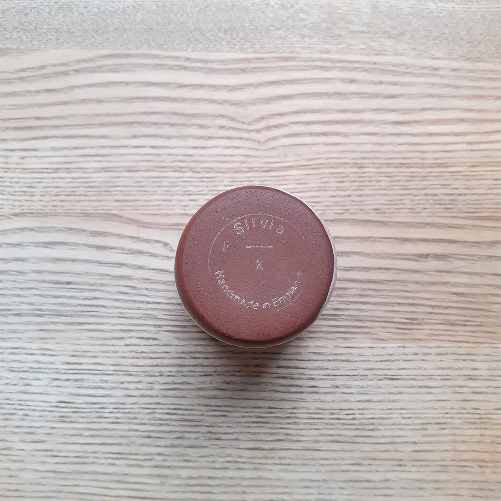This small terracotta beaker is perfect for that morning cup of tea or coffee, and features Silvia K's distinctive glaze decoration in grey.