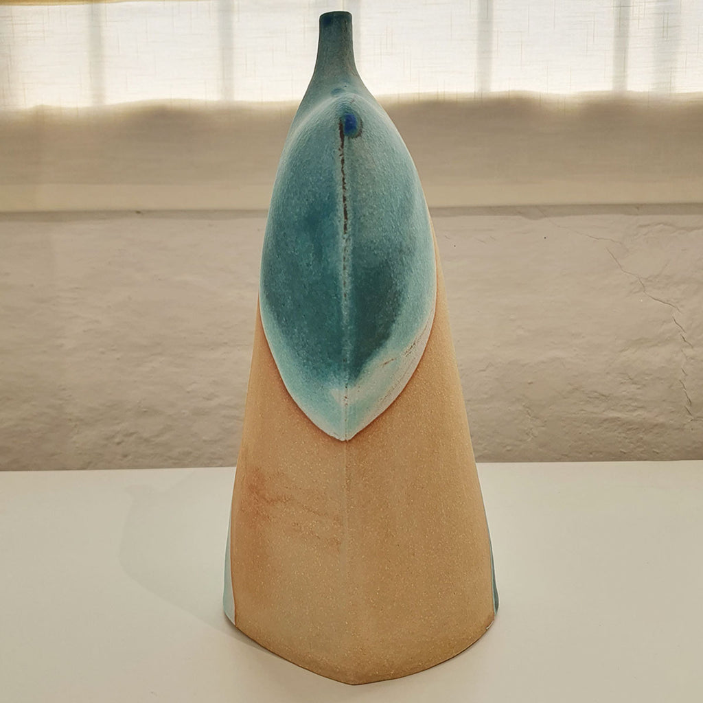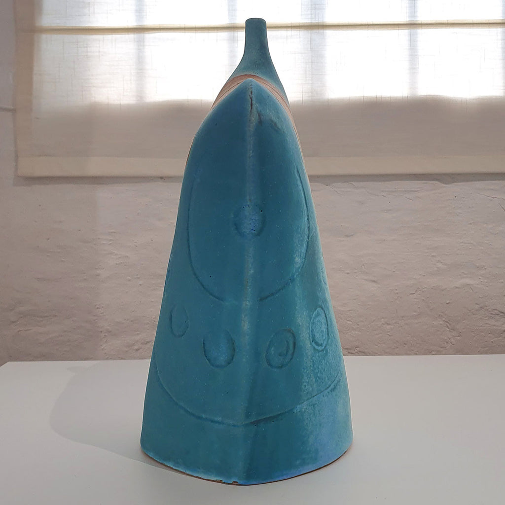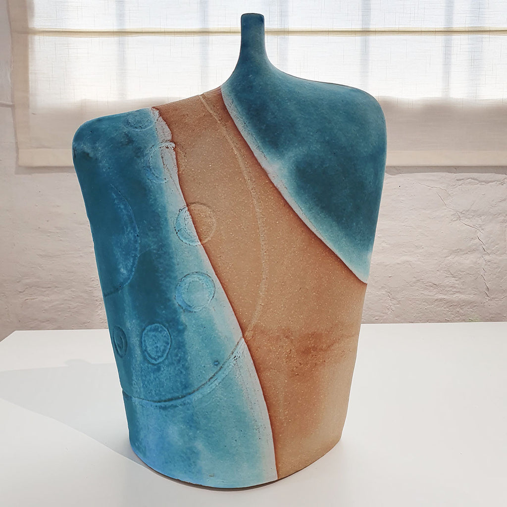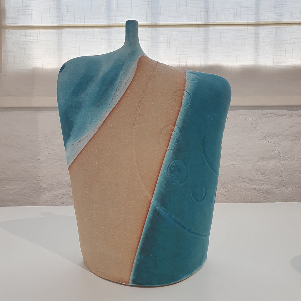 This large Neolithic bottle is inspired by the Neolithic rock carvings found in Kilmartin Glen, Argyll, created using thinly rolled clay to create a light and elegant finished piece. Shapes are figurative, featuring vivid turquoise glaze that reflects the influence of the sea and landscape.