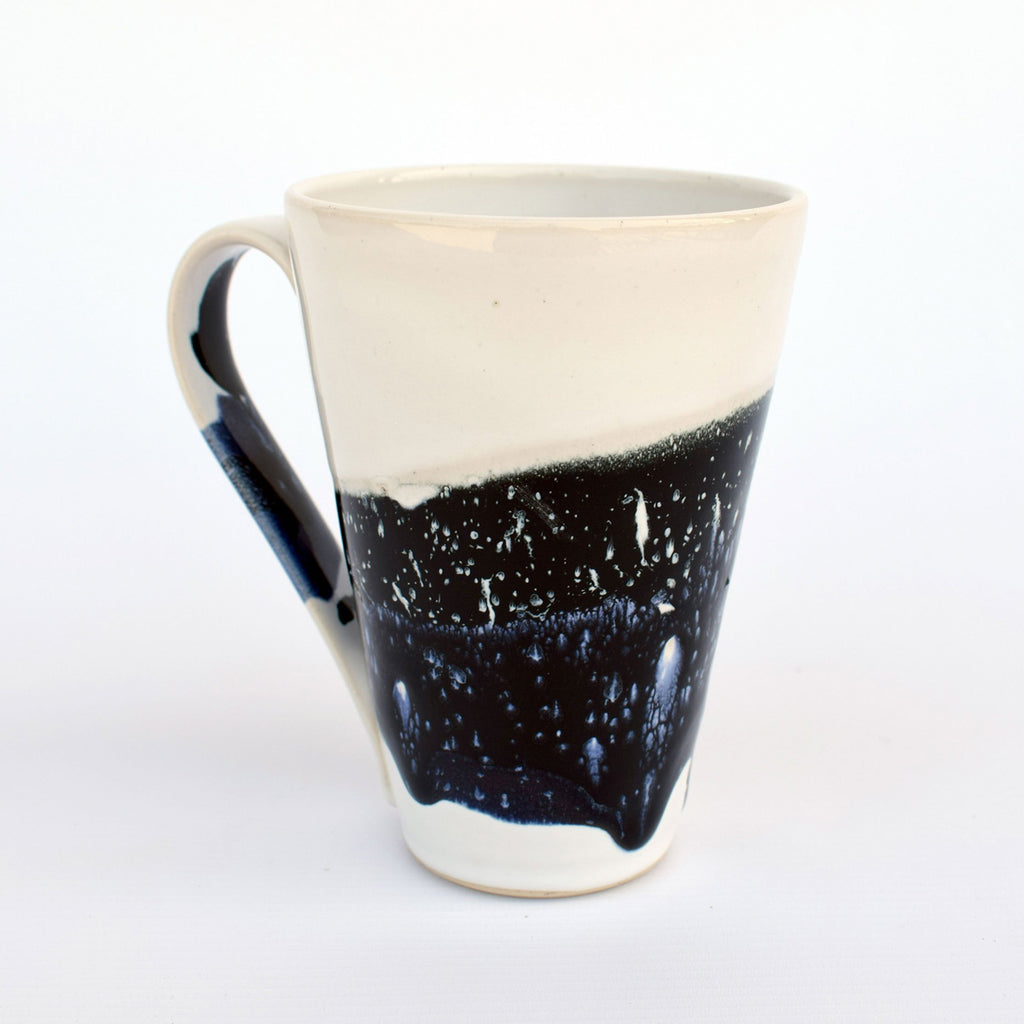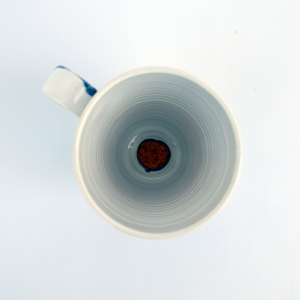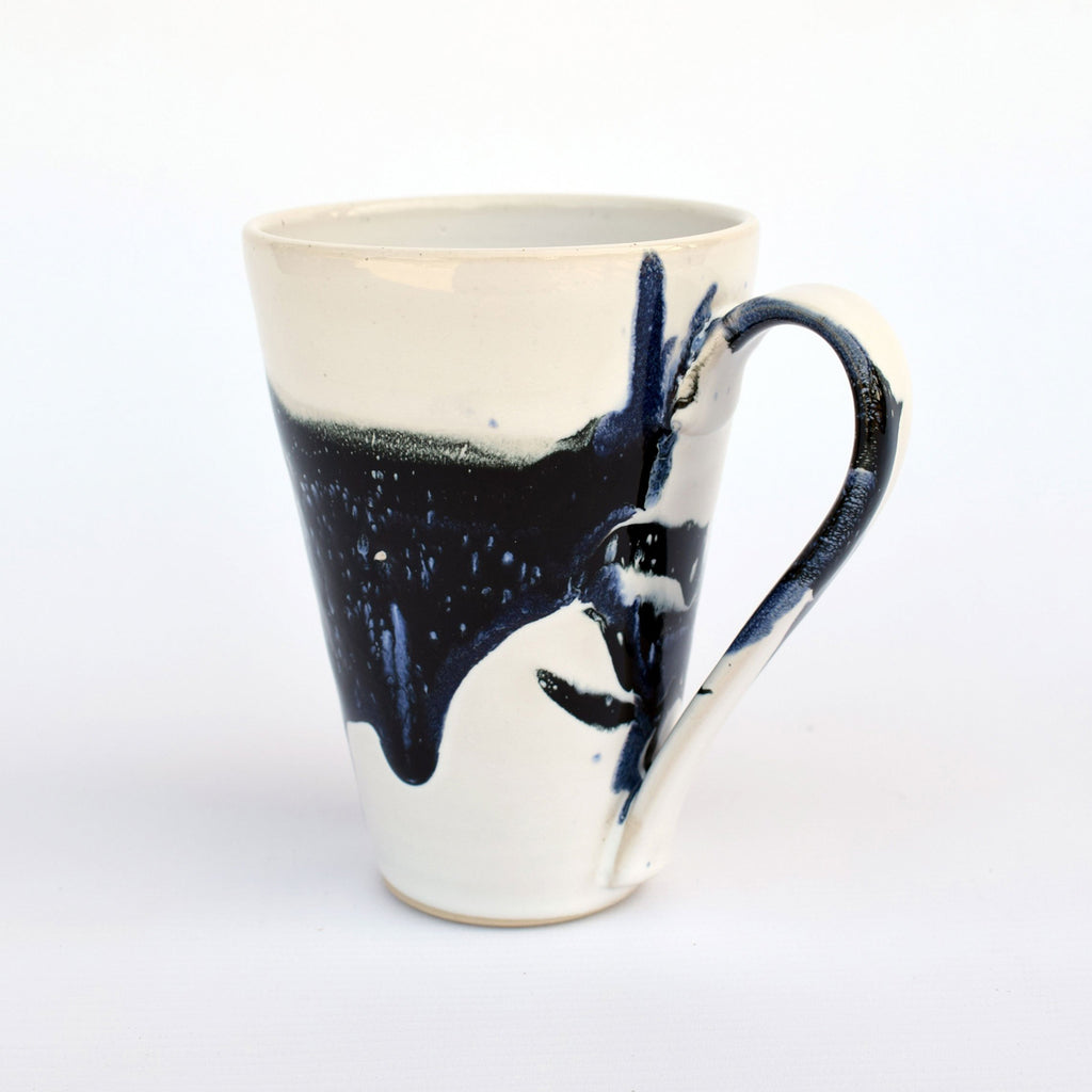 Hand thrown stoneware latte mug, with white glaze, blue and black splash with an orange dot. Dishwasher and microwave safe.