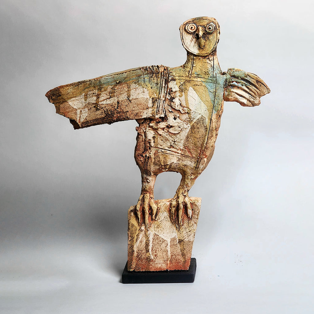 A distinctive and unique Owl sculpture by Christy Keeney. This slab built ceramic piece demonstrates Christy’s fascination with the construction of his figures and the way in which his work overlaps between sculpture and drawing: with details drawn into the wet surface of the clay.