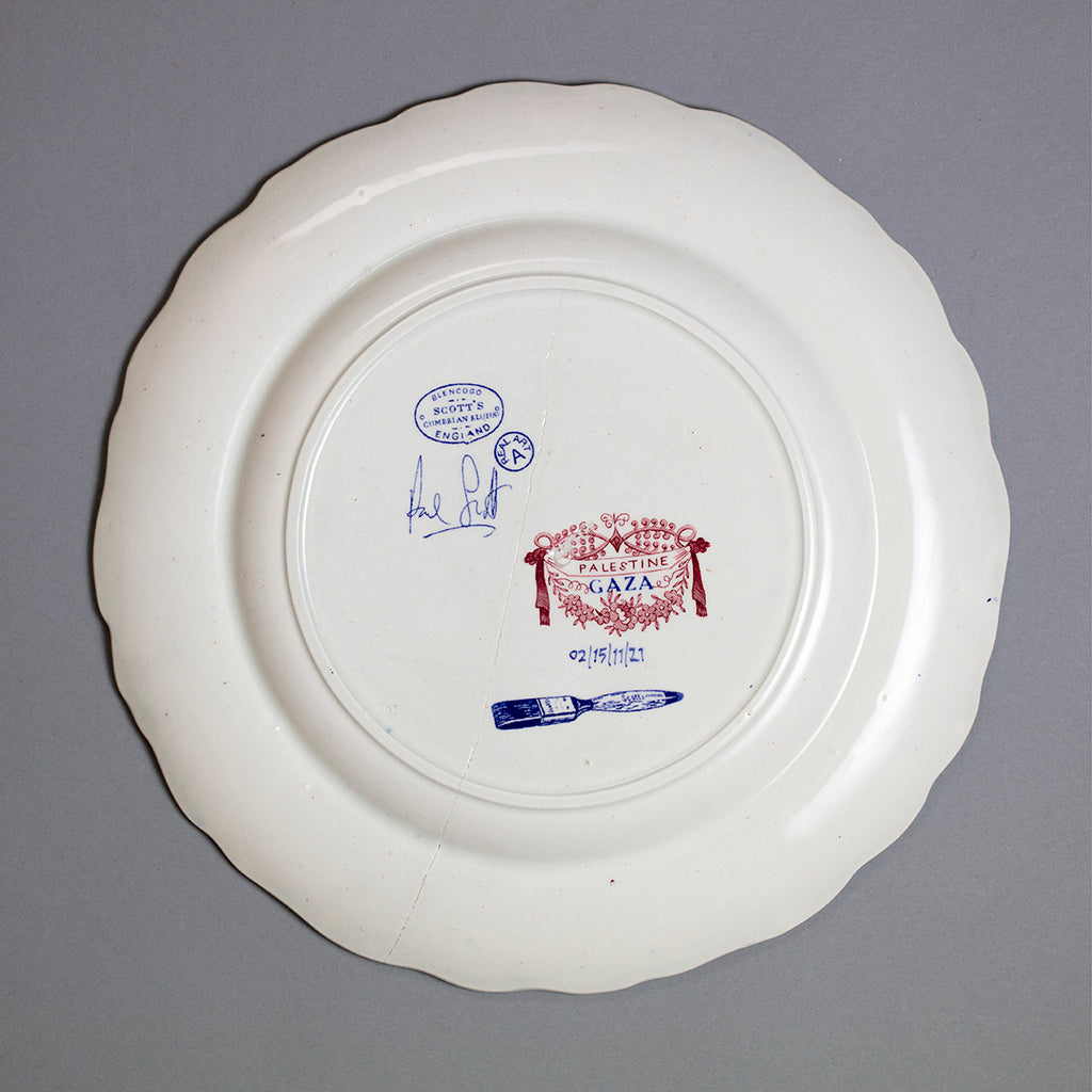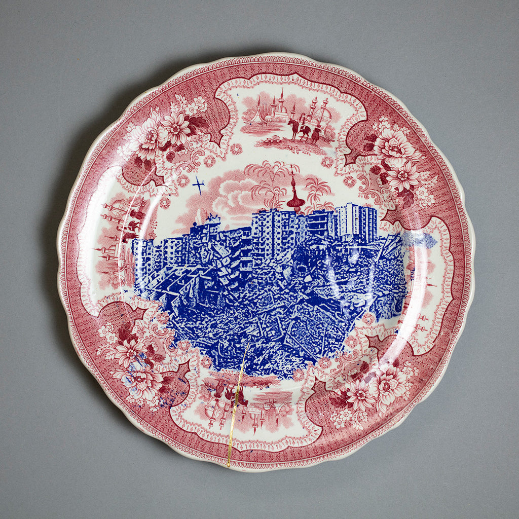 Over the past twenty years or so, Paul has been updating different series with scenes of the contemporary carnage and destruction now evident in those places in the region. Many of the works from these series are made using tablewares that are up to 200 years old, and some are damaged, broken or cracked. This seems entirely appropriate for artworks which depict the wanton destruction of cities, lives and landscapes. Some of the breaks and cracks are repaired using the Japanese technique of Kintsugi, the repair delineated in gold. The gold in these works refers to arms dealers, politicians and regimes who profit from the cultivation of conflict.