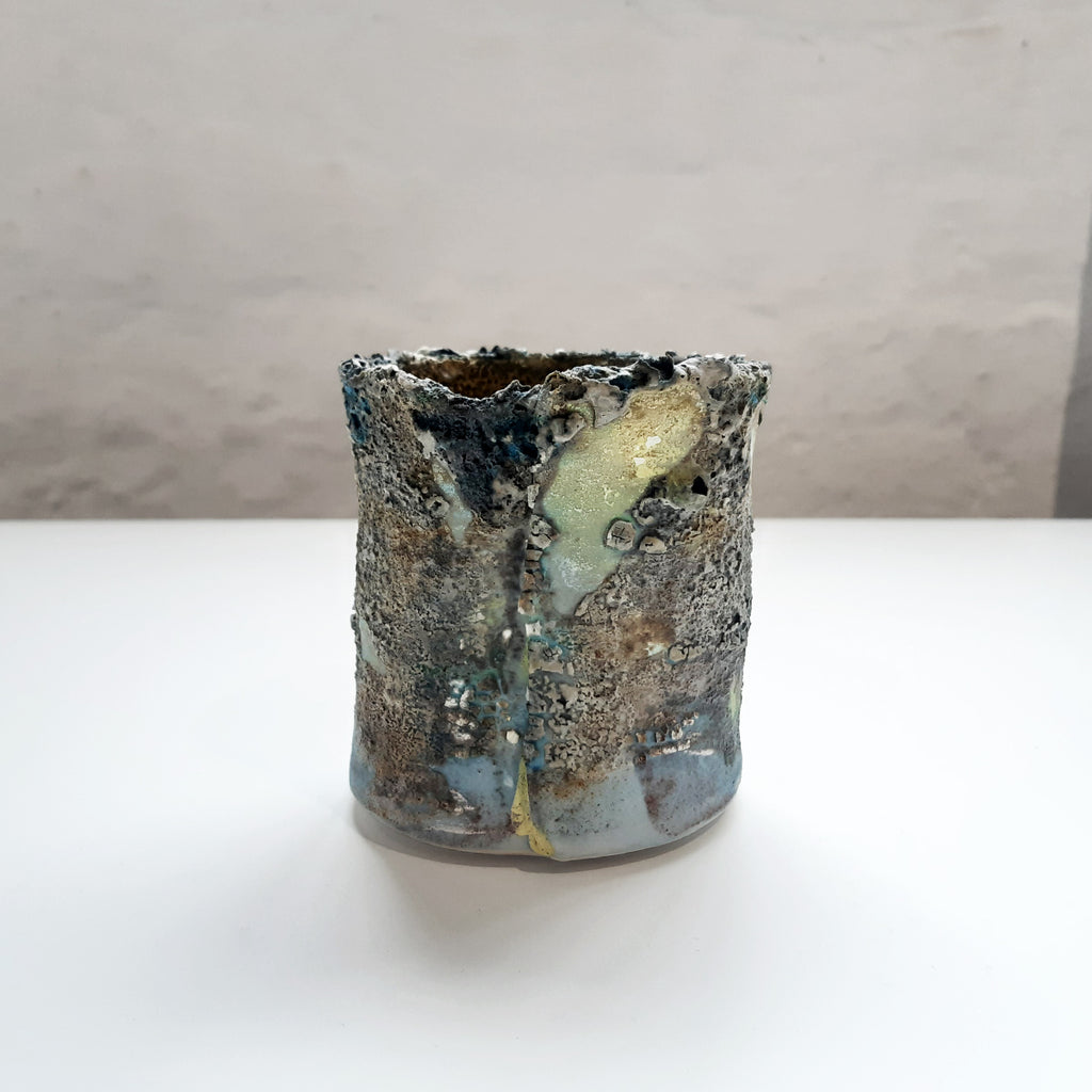 A smaller version of Paul Wearing's cylinder forms, made from slab built porcelain. Certain marks and textures revealing the making process remain as a ground for the glazing.