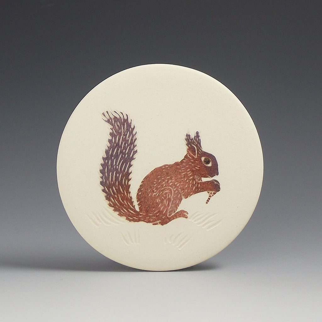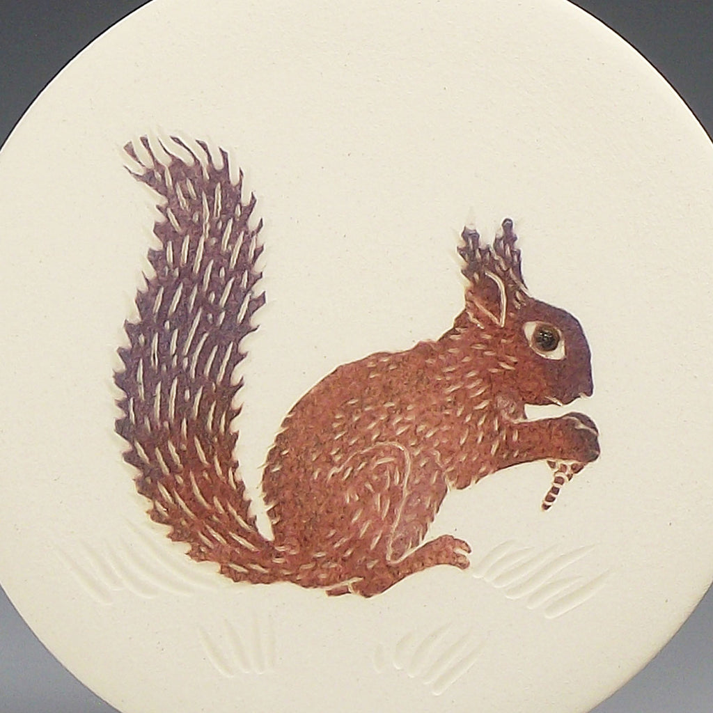 Only the squirrel has been glazed, giving it a lovely shimmer while leaving the rest of the decoration matte. Once completed the piece is left to dry for a few weeks and fired twice in an electric kiln.
