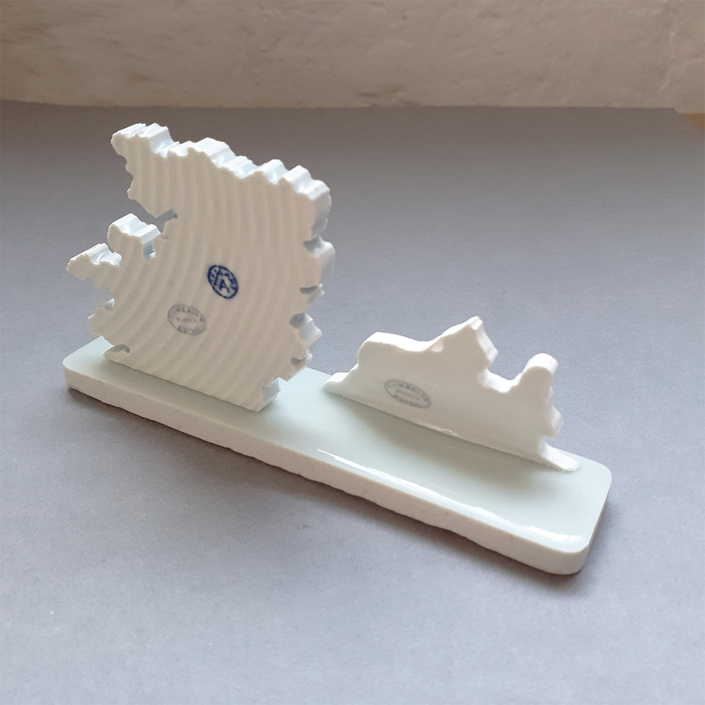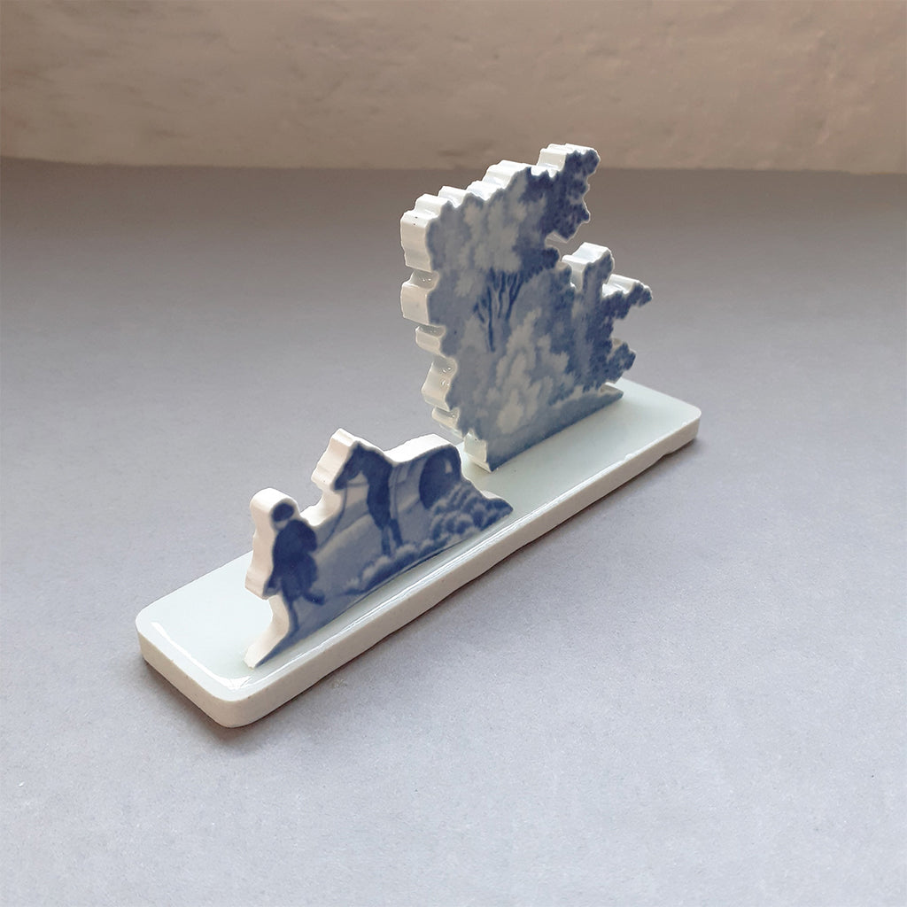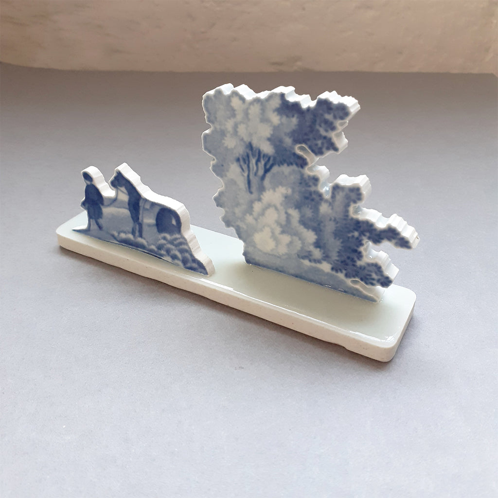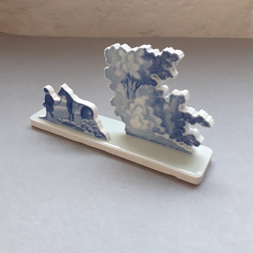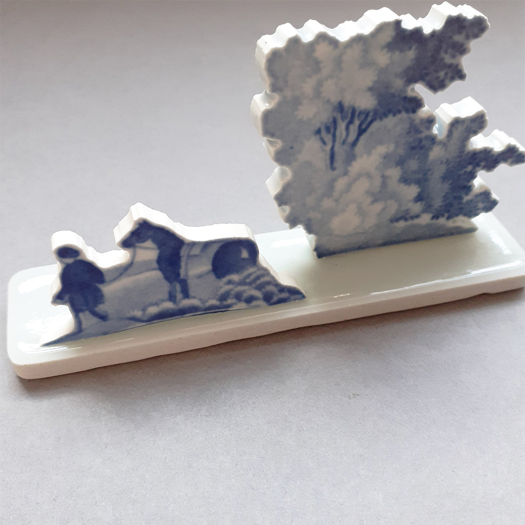 "In 2015 I started harvesting details from fragments of early nineteenth century Willow pattern transferware plates. These ceramic ‘cuttings’ were selected because of their visual similarity to foliage and plant material that I propagate in my garden. By placing them onto the surface of plates and platters I found myself specifically referencing the horticultural. Some cut fragments did not work as compositional material so I discarded them onto a spare plate where they took on the appearance of ‘prunings’ - the kind of plant material that finds its way to the compost heap.