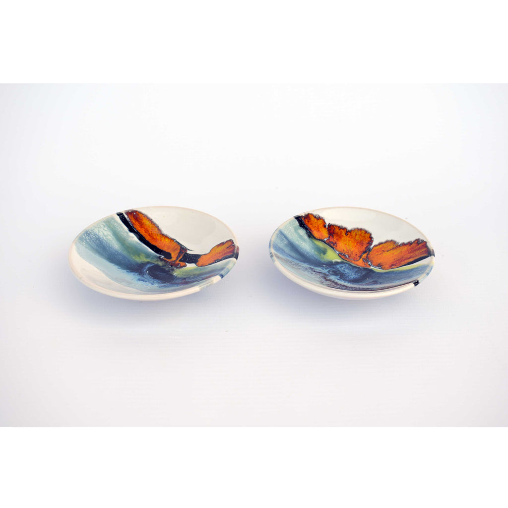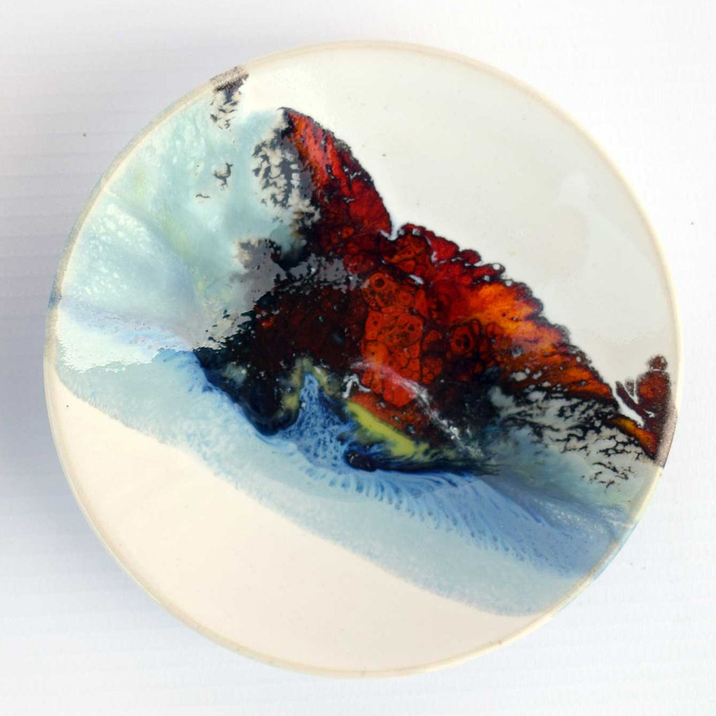 Hand thrown XS stoneware bowl, in white glaze with blues, greens, reds and orange.