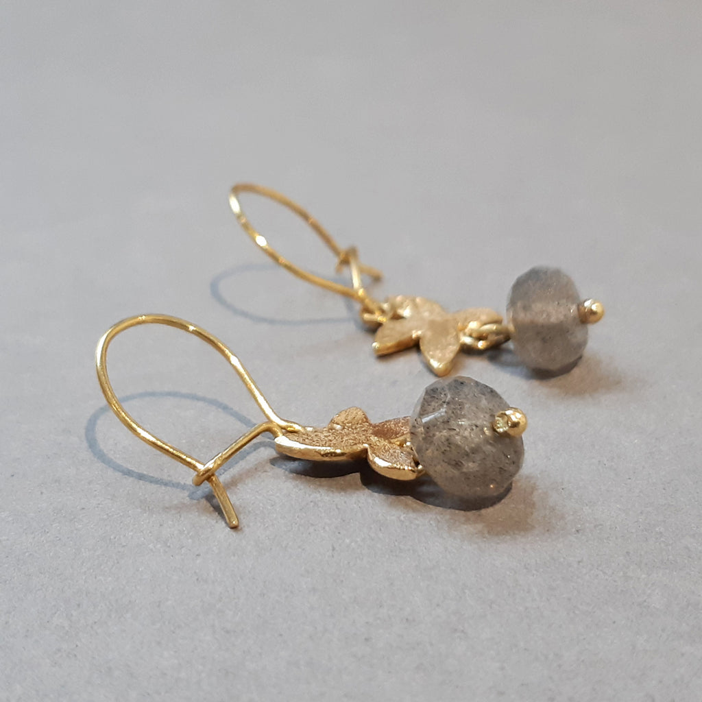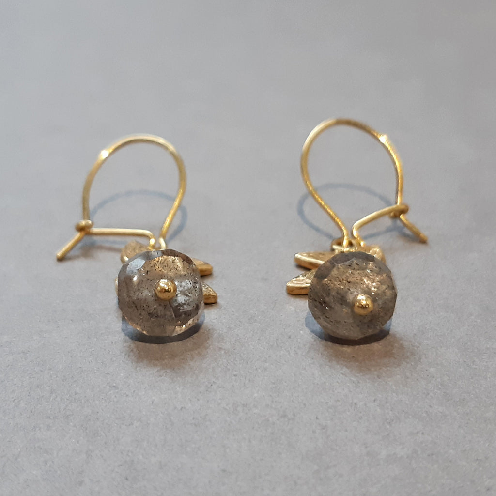 18ct gold earrings featuring a stylised bird in flight above a labradorite stone.