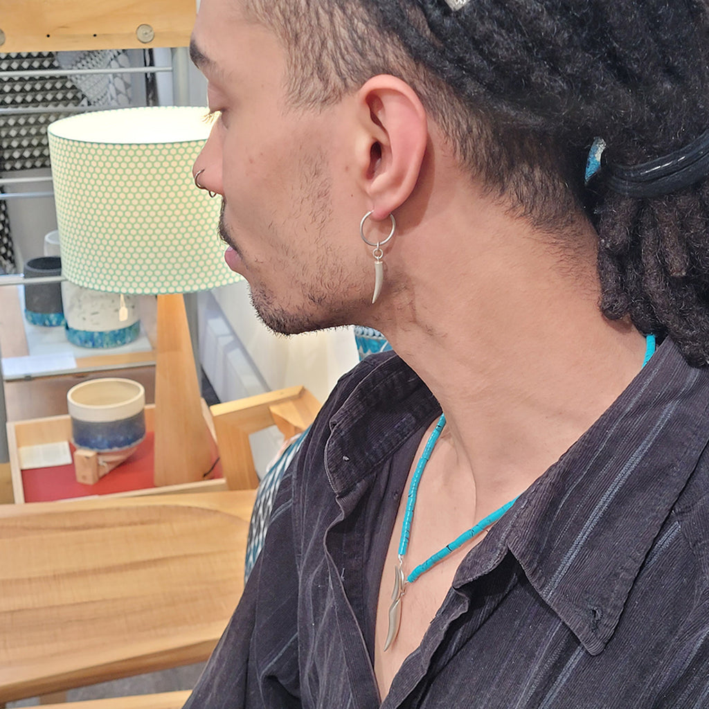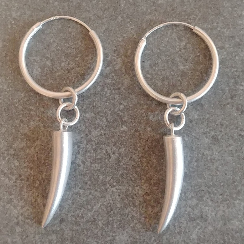 These tusk and hoop earrings are made by local jeweller Kate Moult. The tusks are made from sterling silver using traditional jewellery techniques. Wax is hand carved into the tusk shapes and then cast into silver and finished by hand.