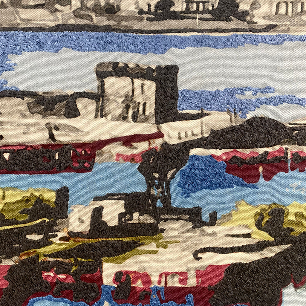 Layered threads build depth and atmosphere across the canvas, transforming stitch into a richly detailed surface that feels both painterly and tactile. The piece evokes a quiet sense of rhythm and movement, suggesting the integration of architecture, water, and light, while maintaining a delicacy that is distinctly hand-crafted.