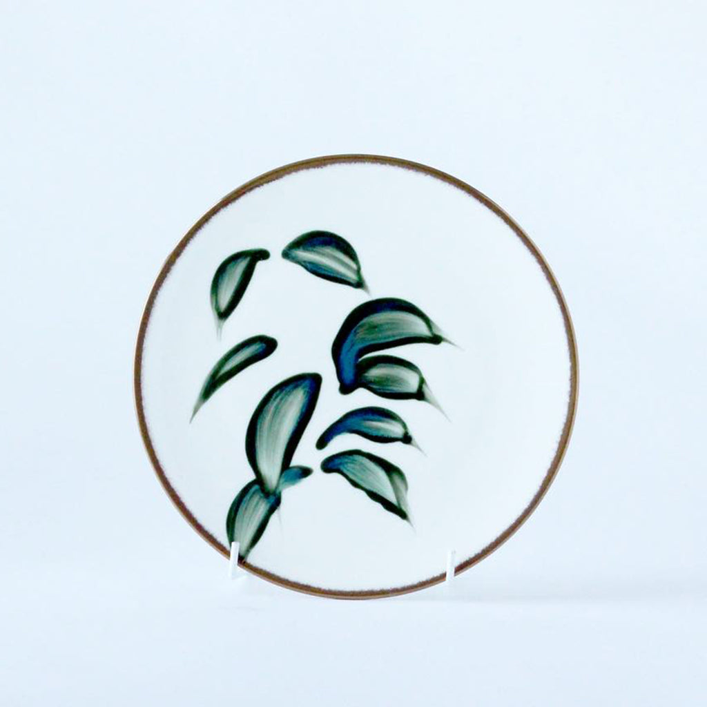 A 4 x piece fine bone china dinner set, hand decorated by Reiko Kaneko with a botanical design and finished with gilded rims.