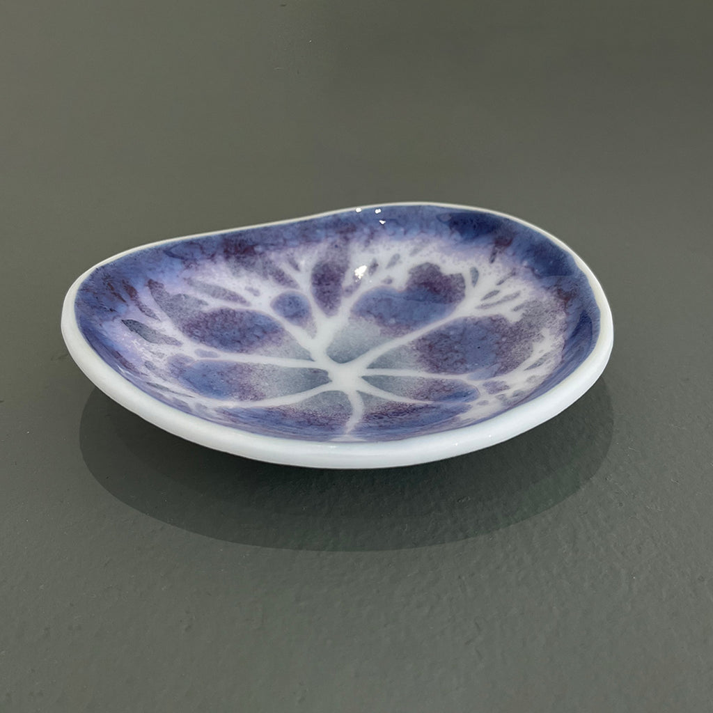 A kiln-formed glass dish with a beautiful design of algae on the surface.