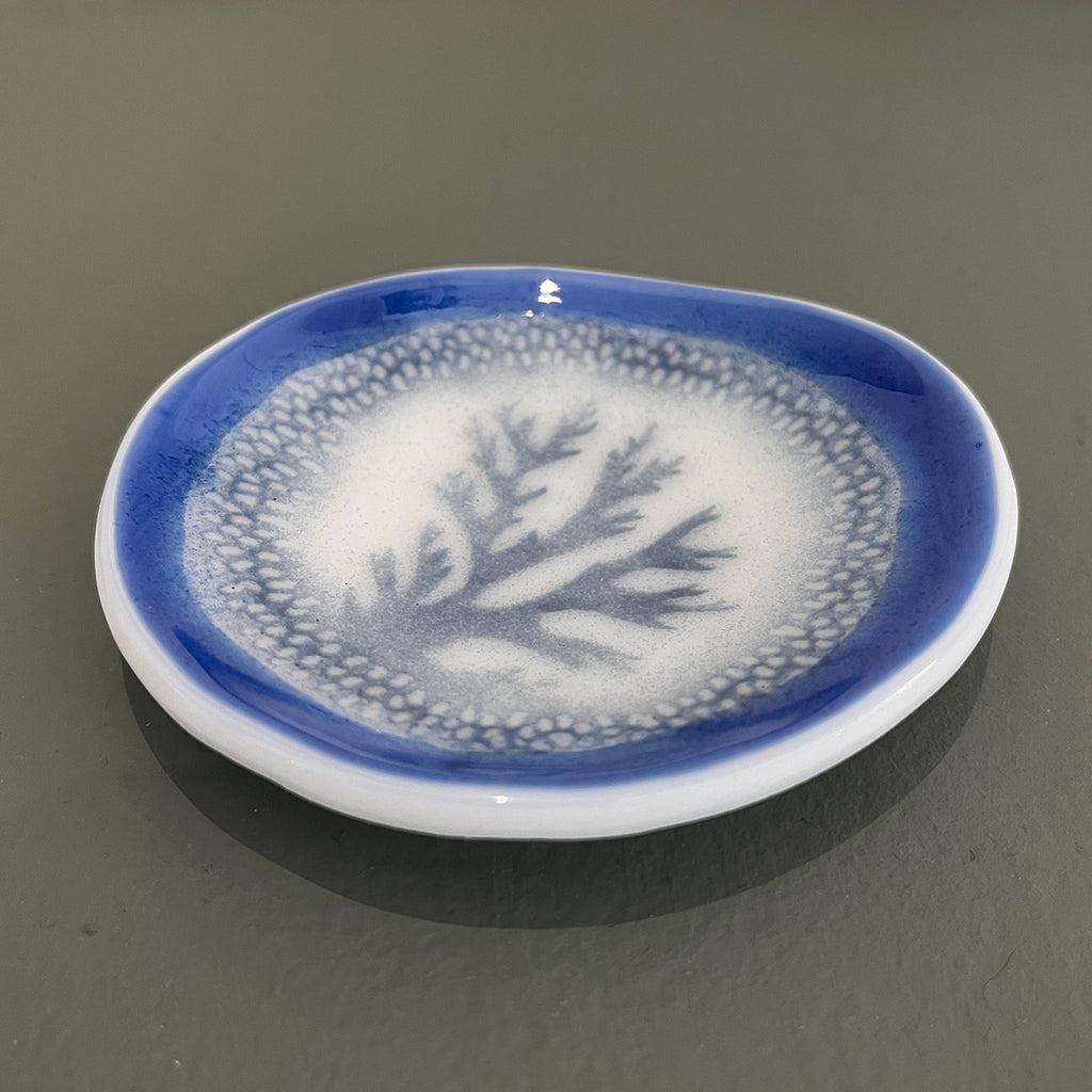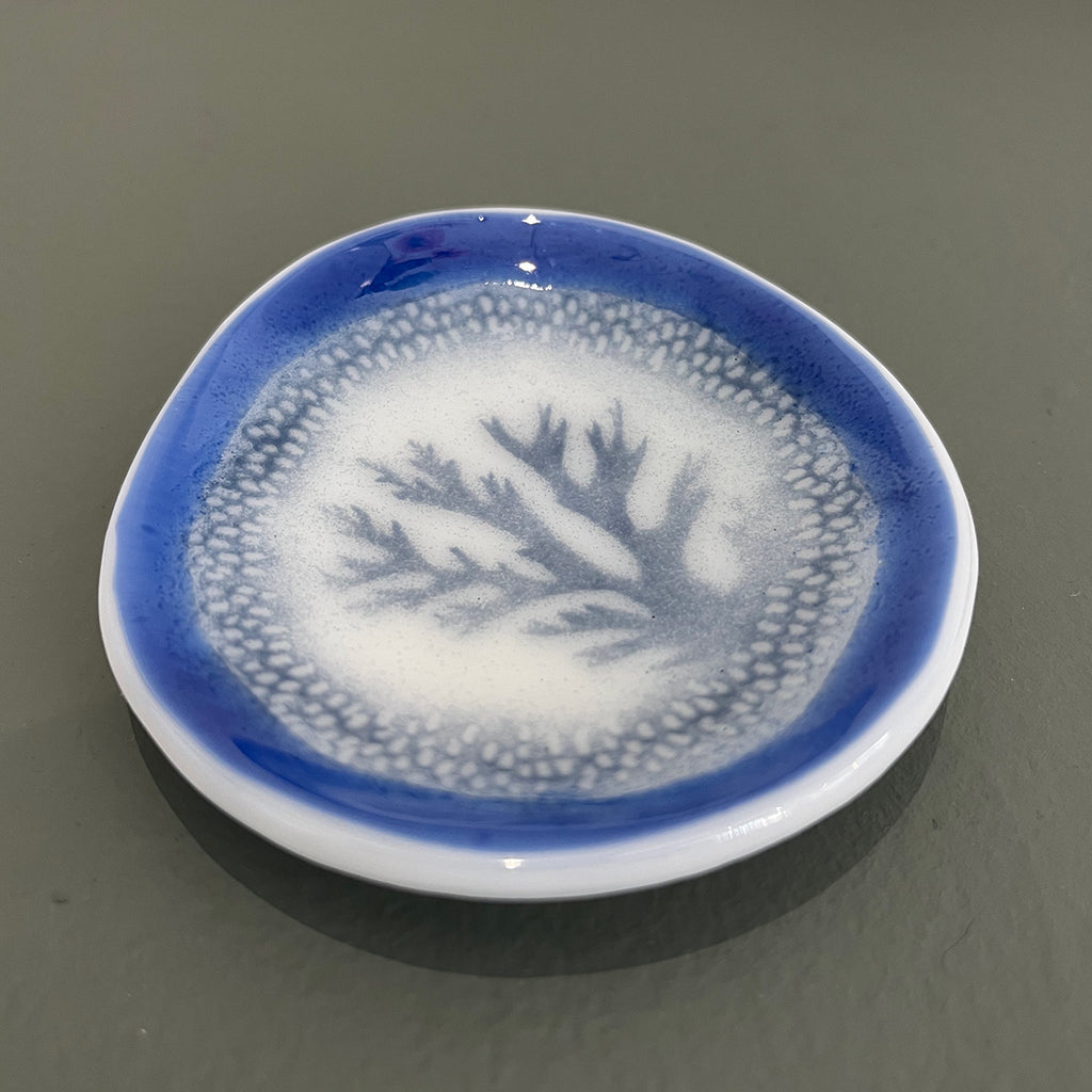 A kiln-formed glass dish with a beautiful design of algae on the surface.