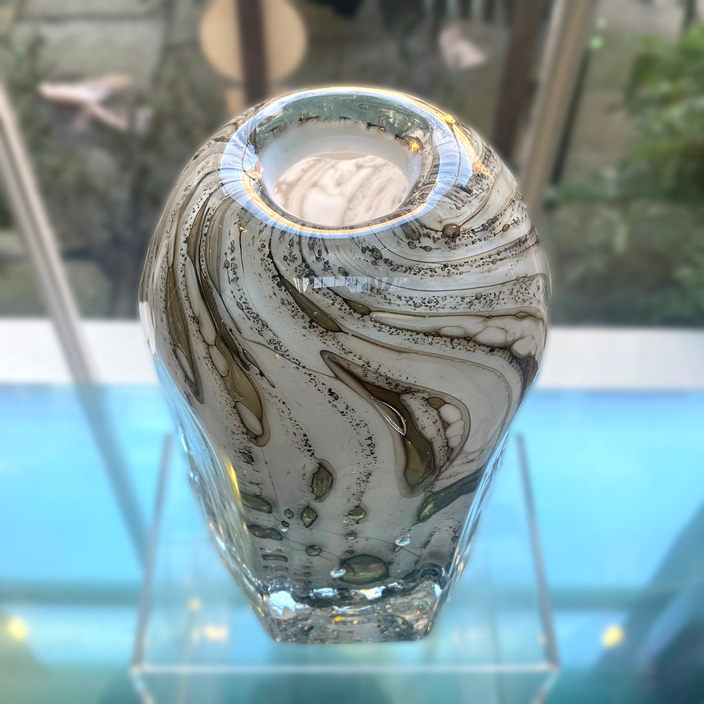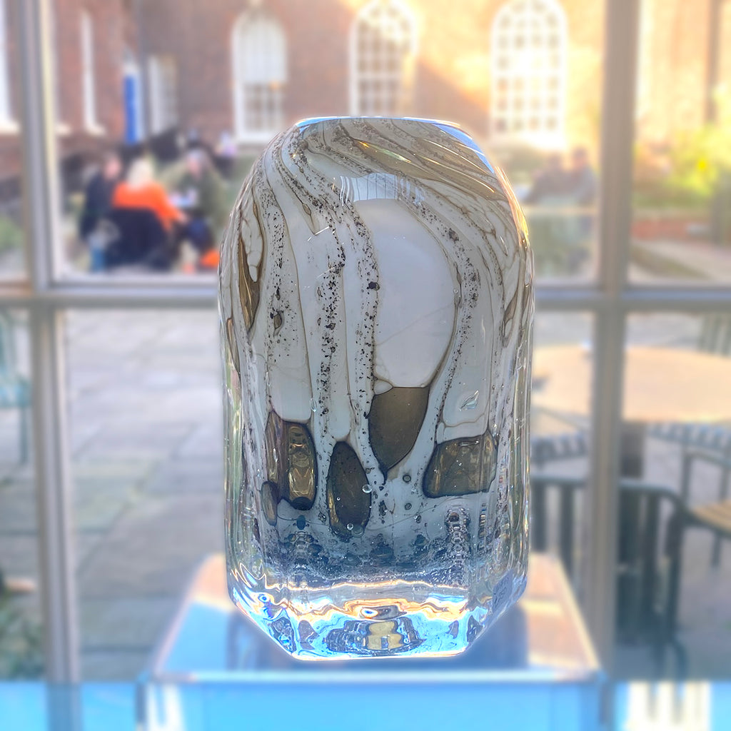 This striking Large White Hexagonal Vase by Mark Fenn is infused with honey from his Welsh native black bees.
