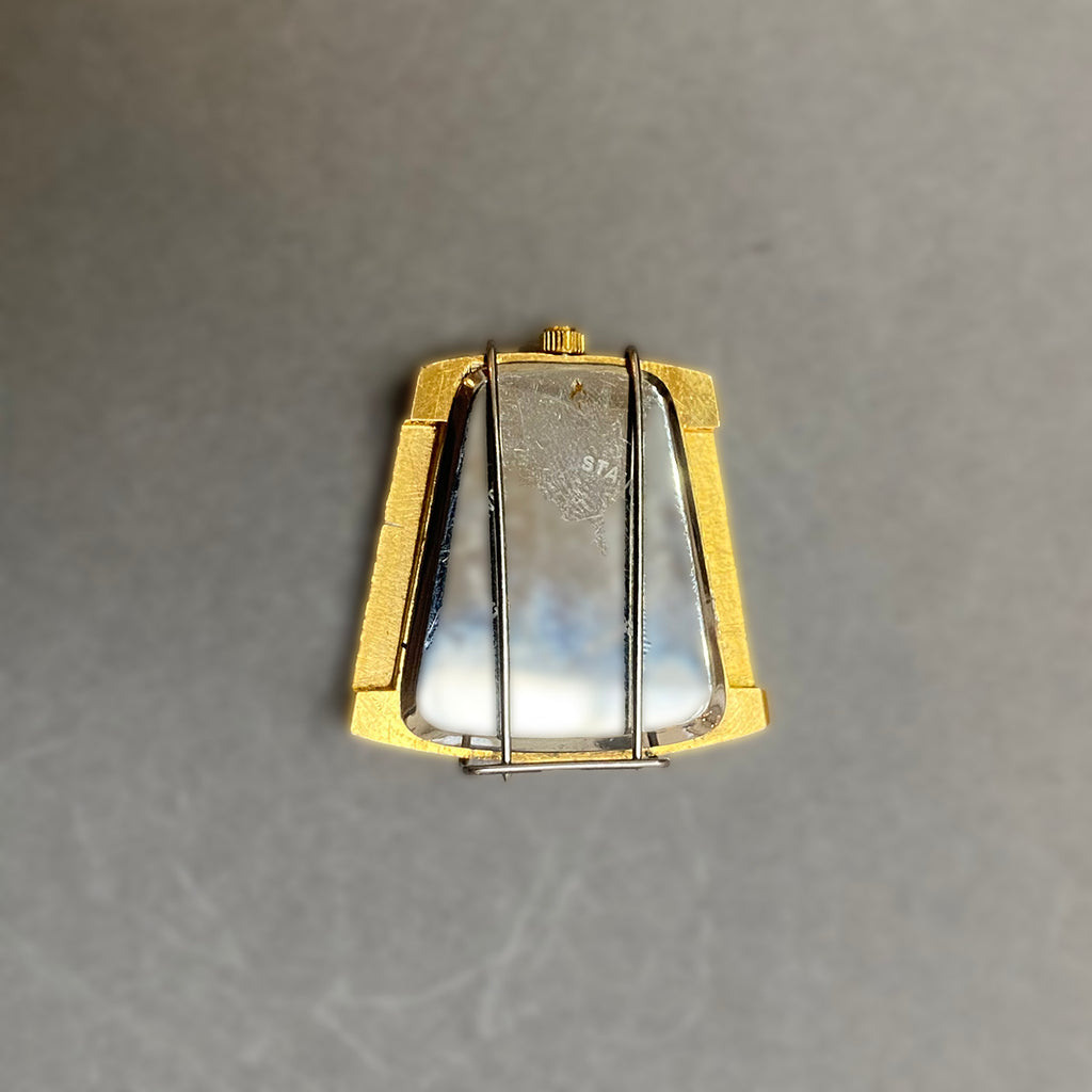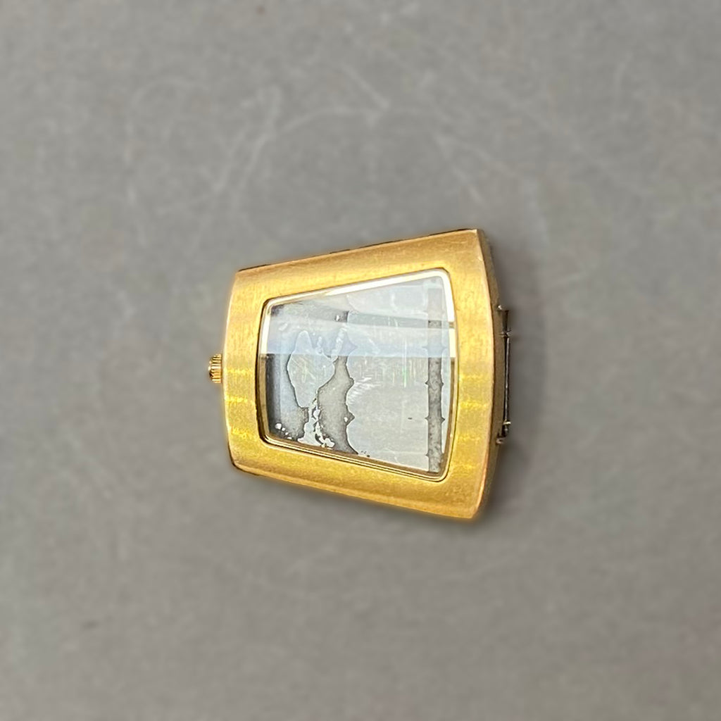 A beautiful brooch made from found objects, crafted from an old gold watch face with silver and steel by Issac Heath.