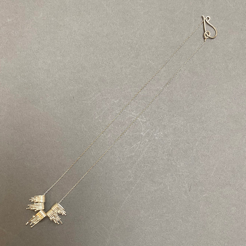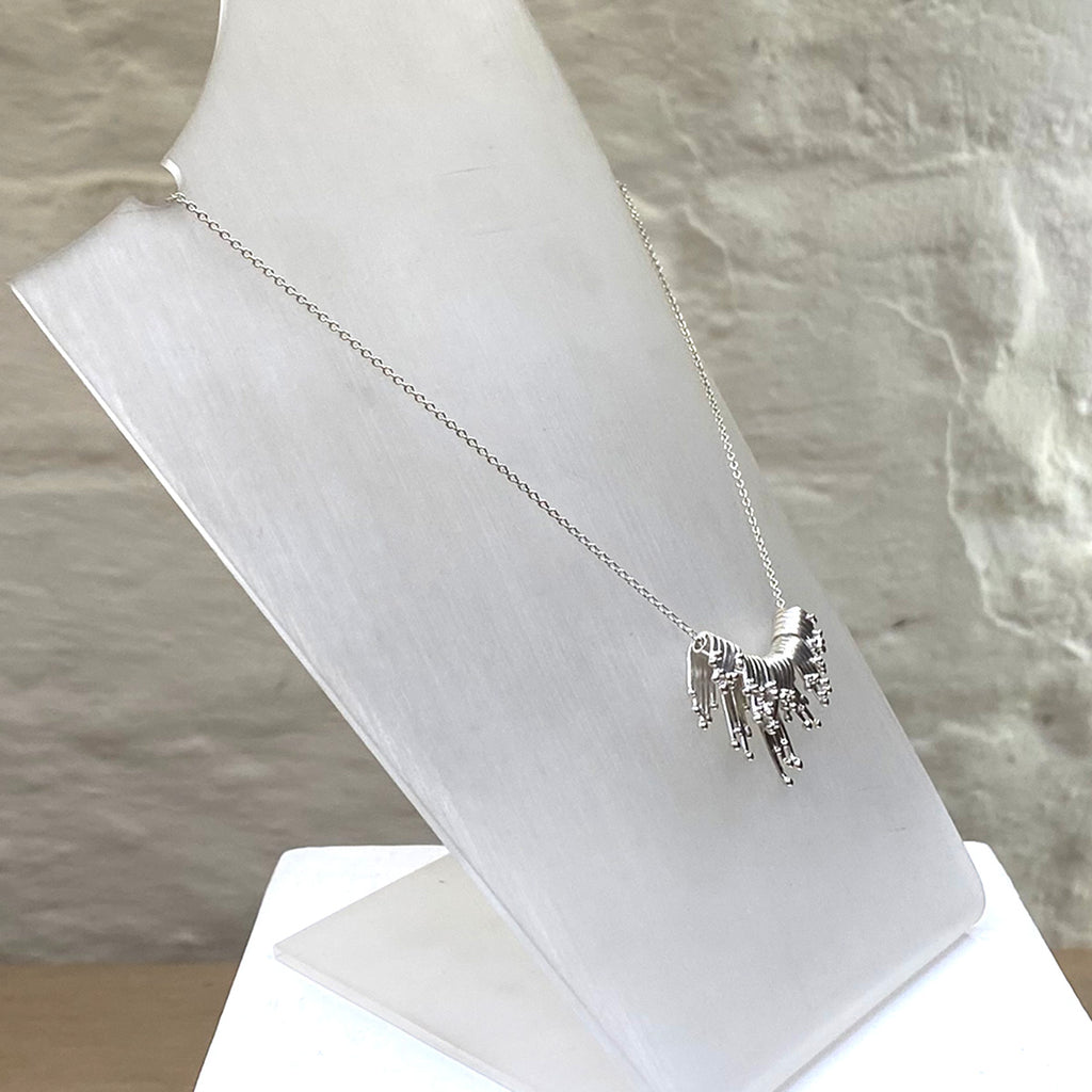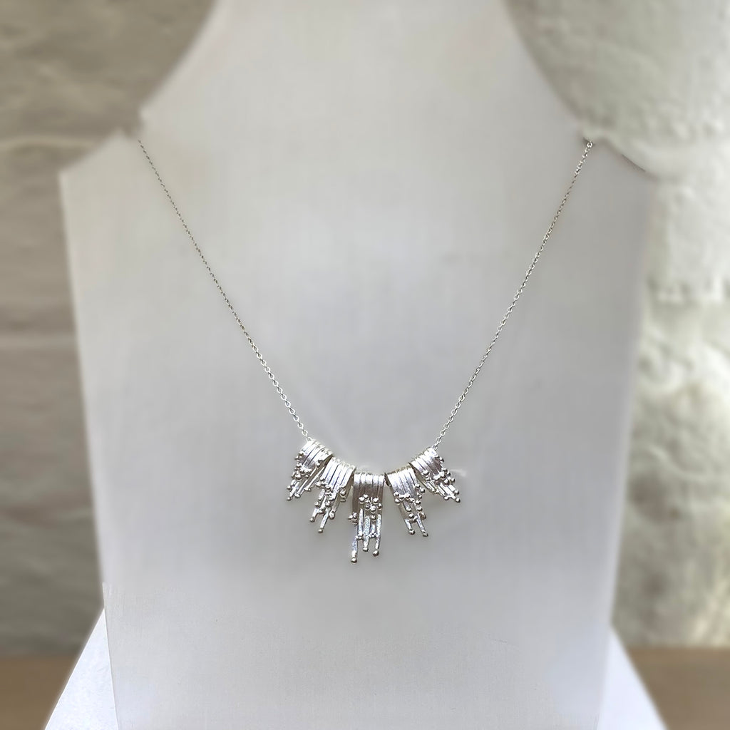 A stunning silver tidal pendant necklace with 5 components. This piece represents cascading silver waves tipped in shimmering granulation in this sculptural pendant.