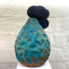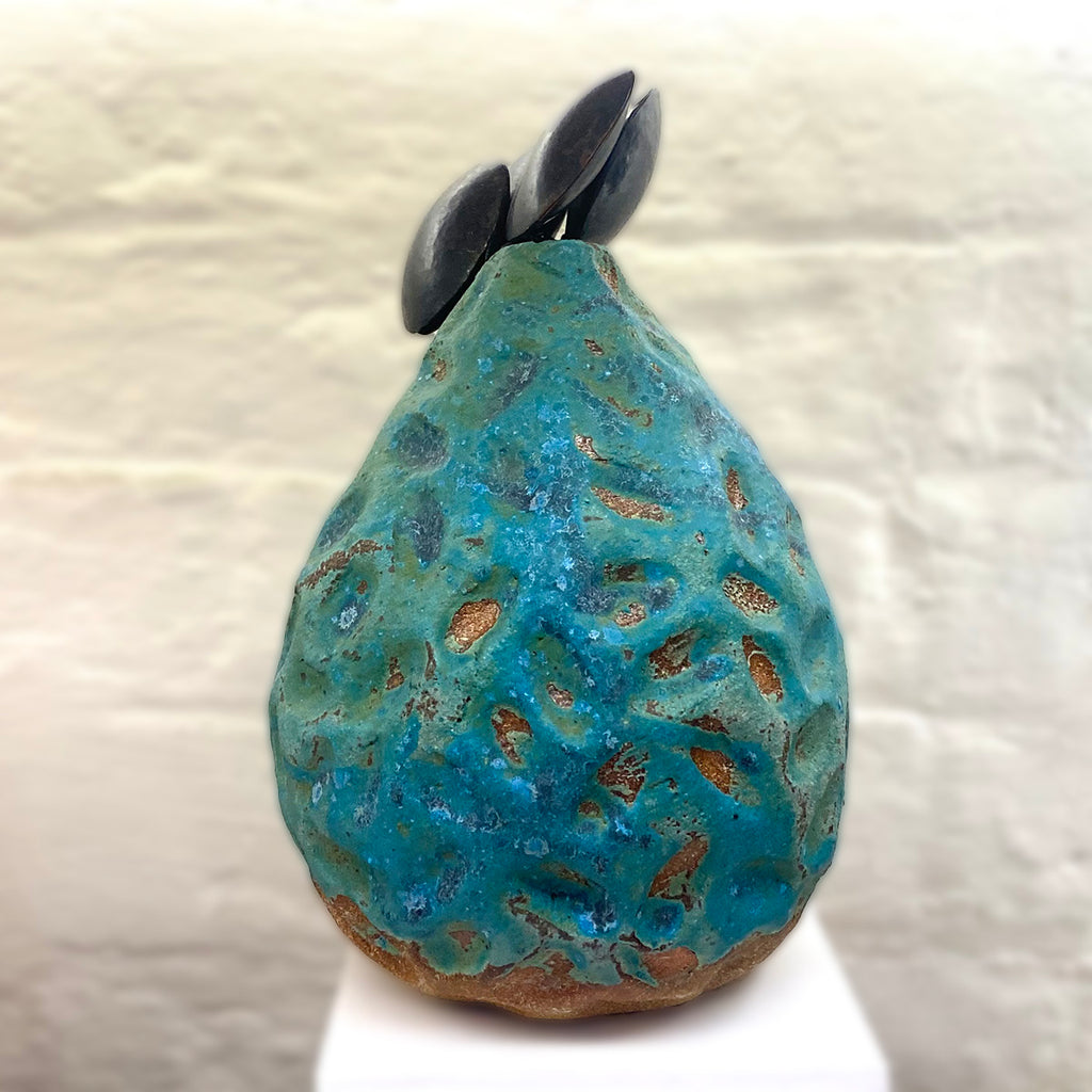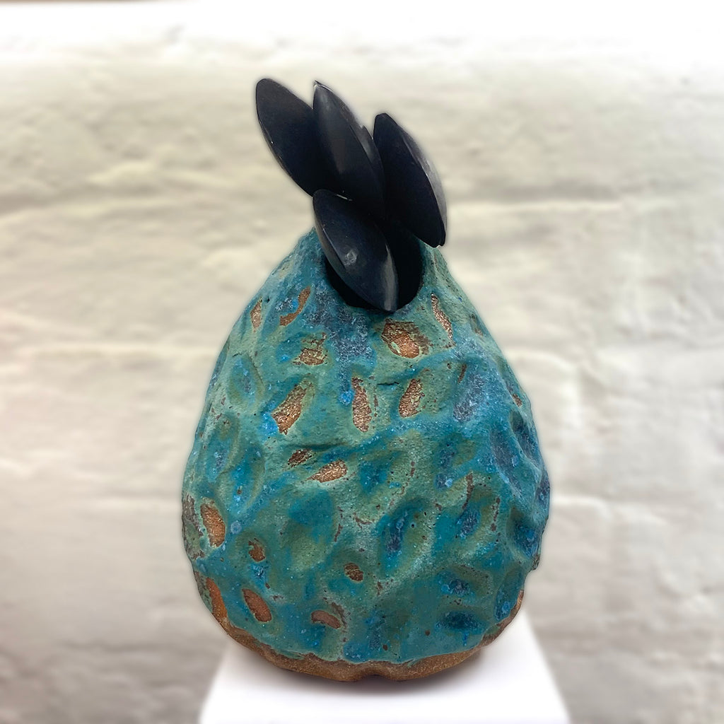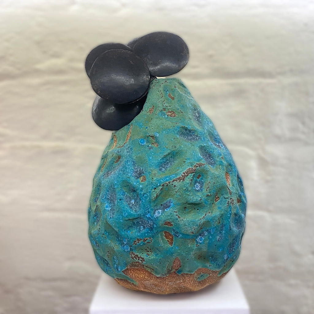 This piece features a beautiful oxidised copper exterior to the ceramic vessel and irregular geometric shaped adornments at the top of the vessel.