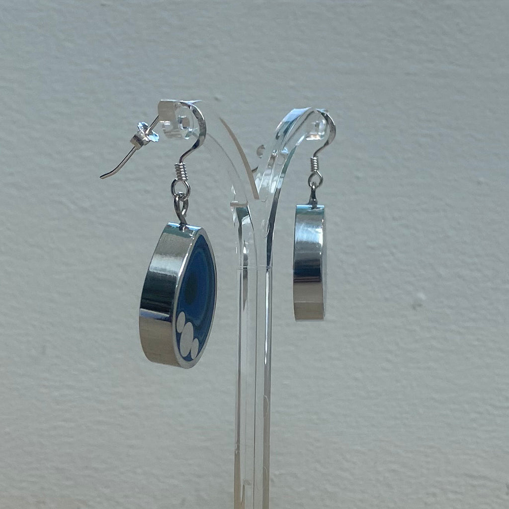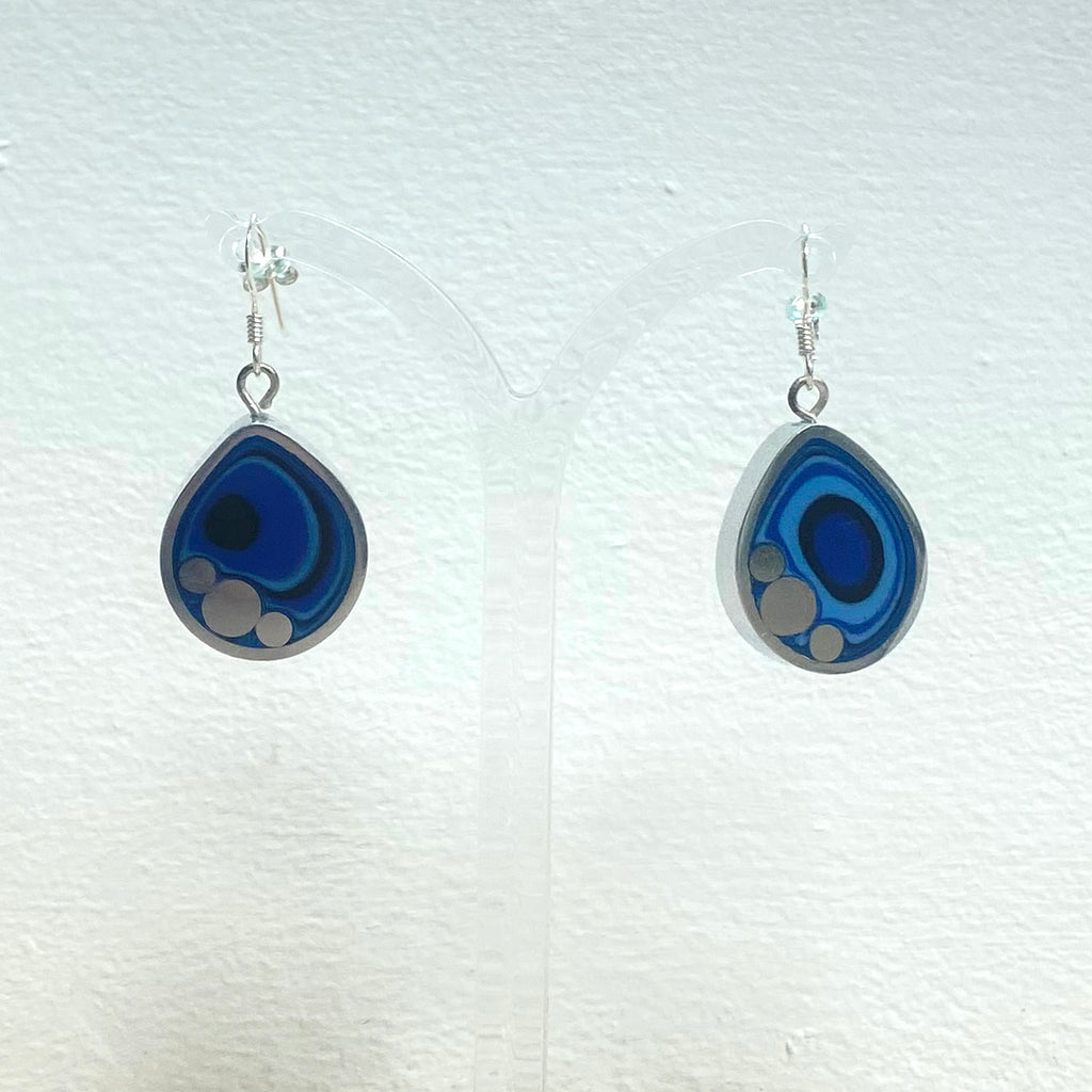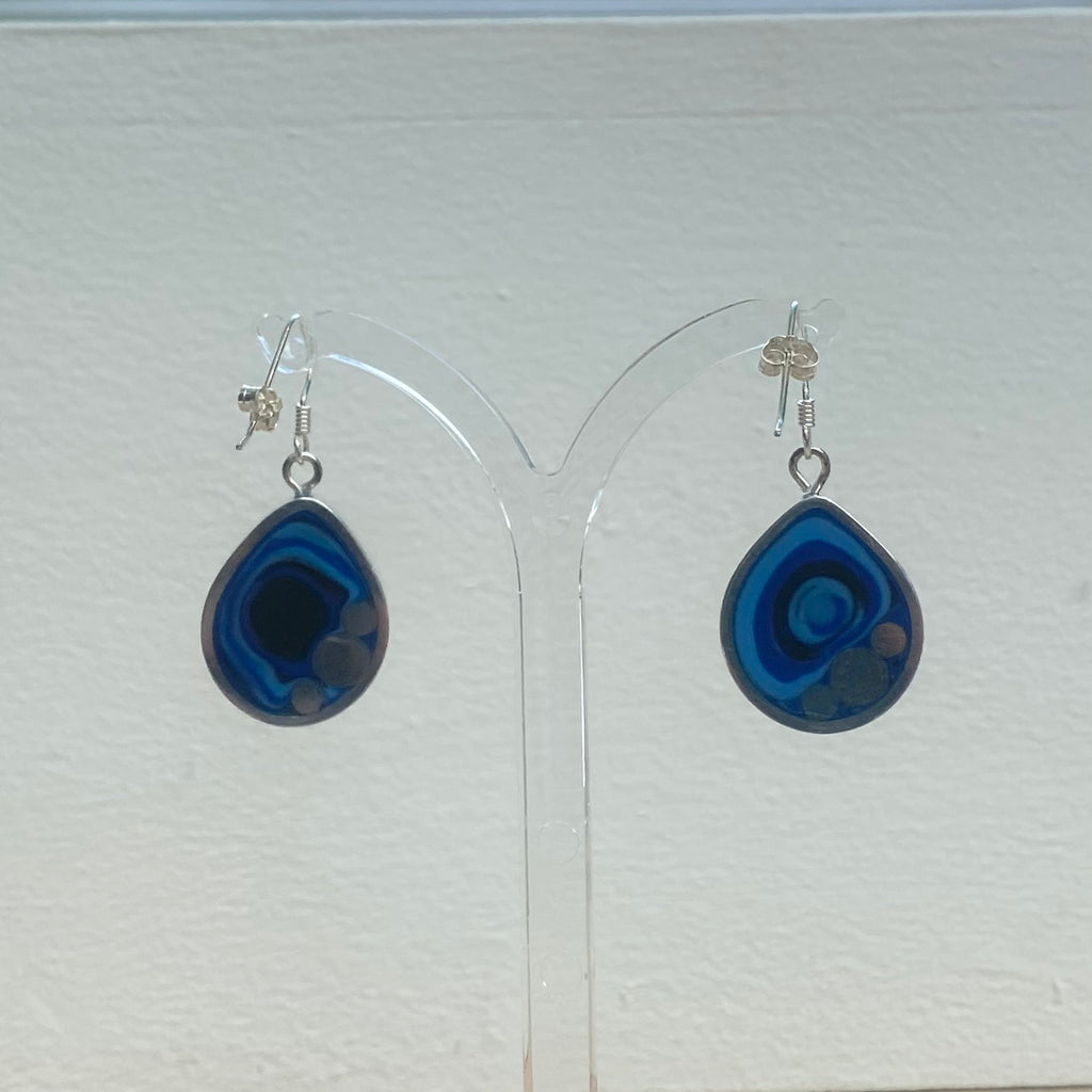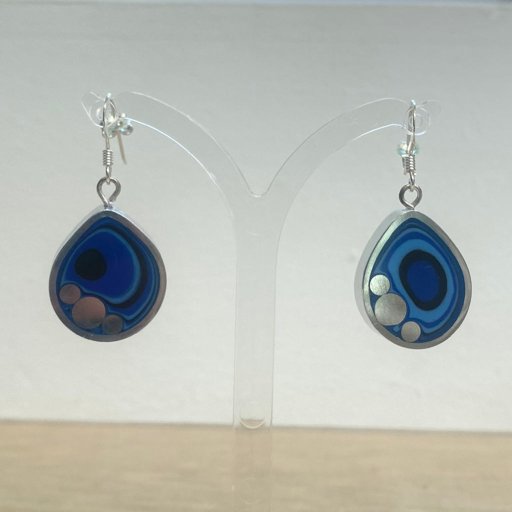 Teardrop-shaped earrings in 'Ocean' - a swirling mix of multi-toned blues and black resin - with aluminium inclusions and surround. The design of these earrings are contemporary, unique and original, while the inspiration for the colour comes from the gorgeous rich colour of the ocean.