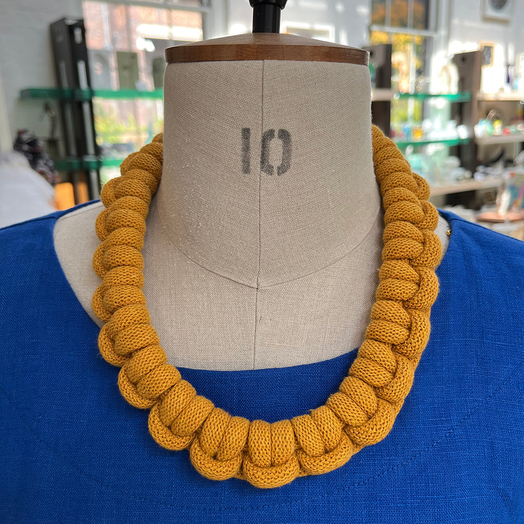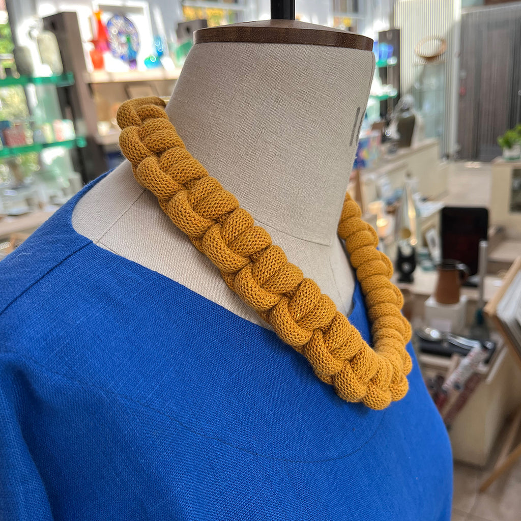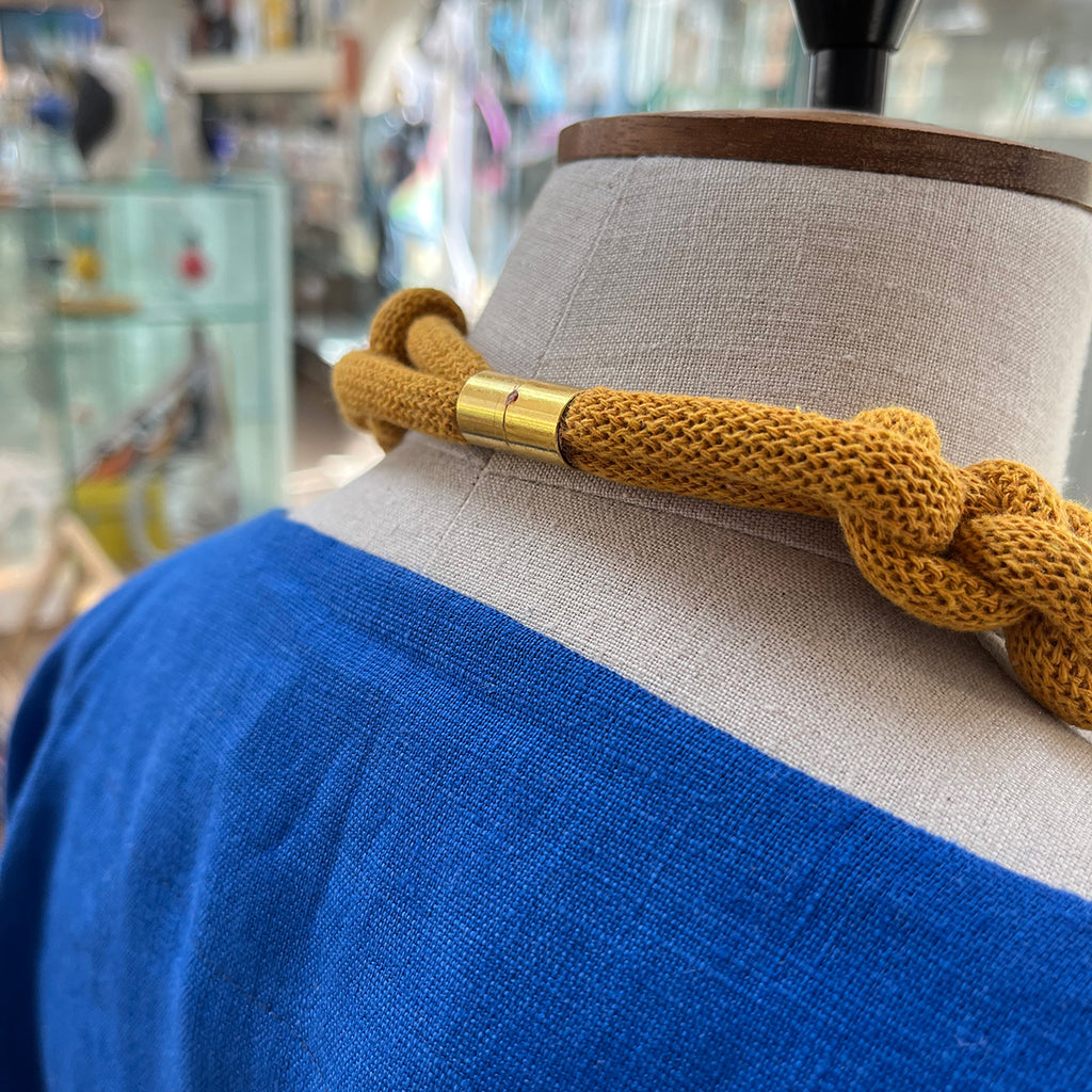 This necklace is made from soft mustard-coloured cotton rope. It has an inner circumference of approximately 45cm and has a gold-plated magnetic tube clasp to open and close.