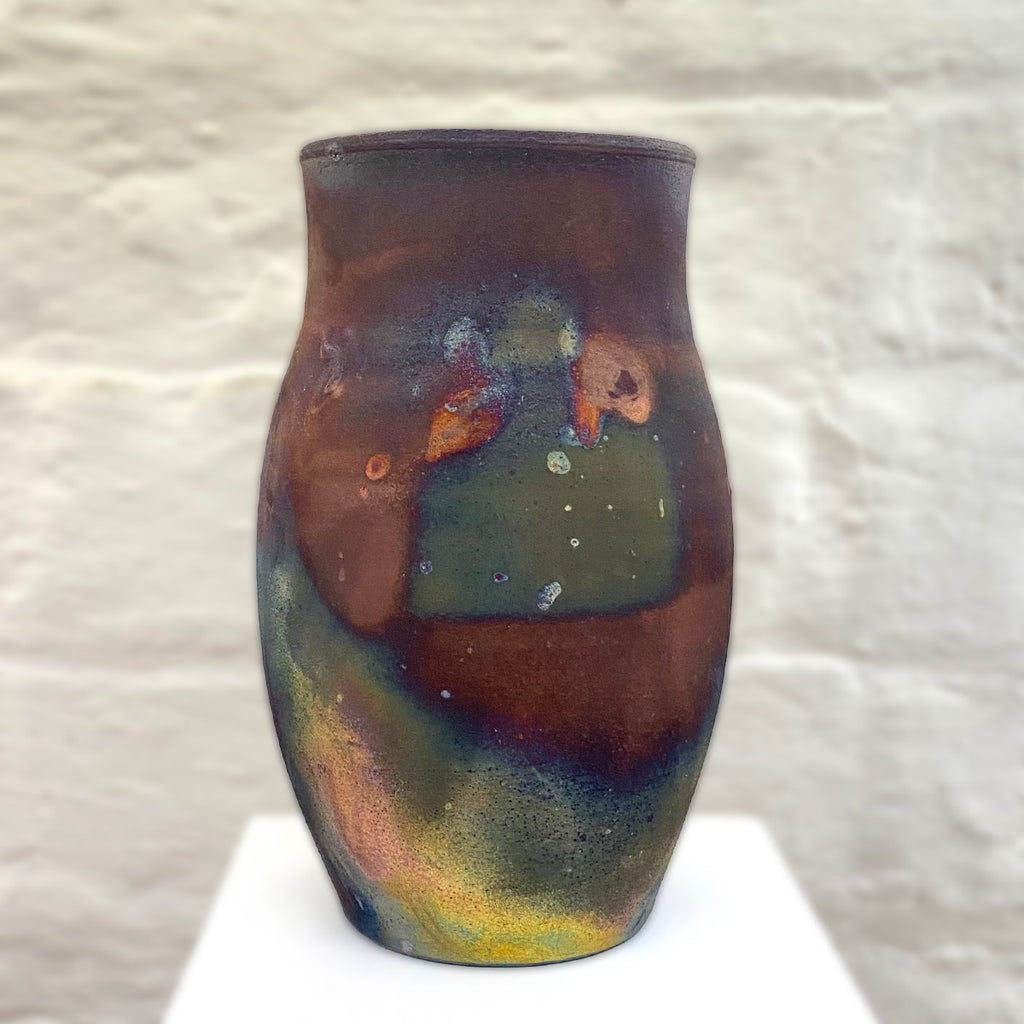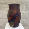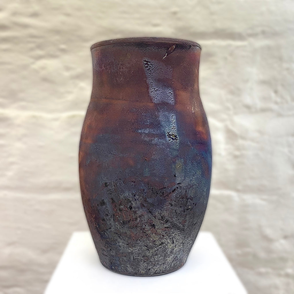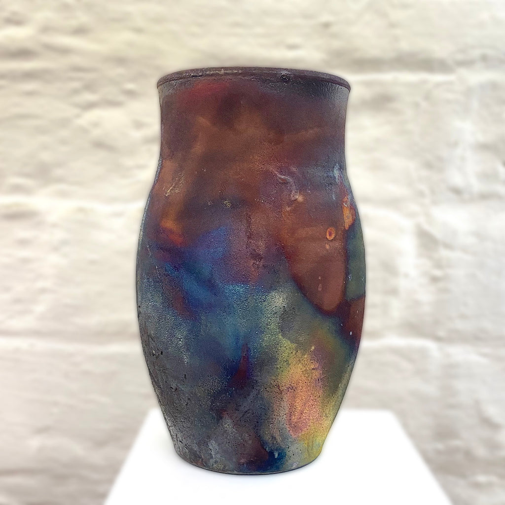 Bryony has used fumed copper oxide on her raku vessels, which gives an infinite spectrum of exciting colours and surface qualities, no two the same.