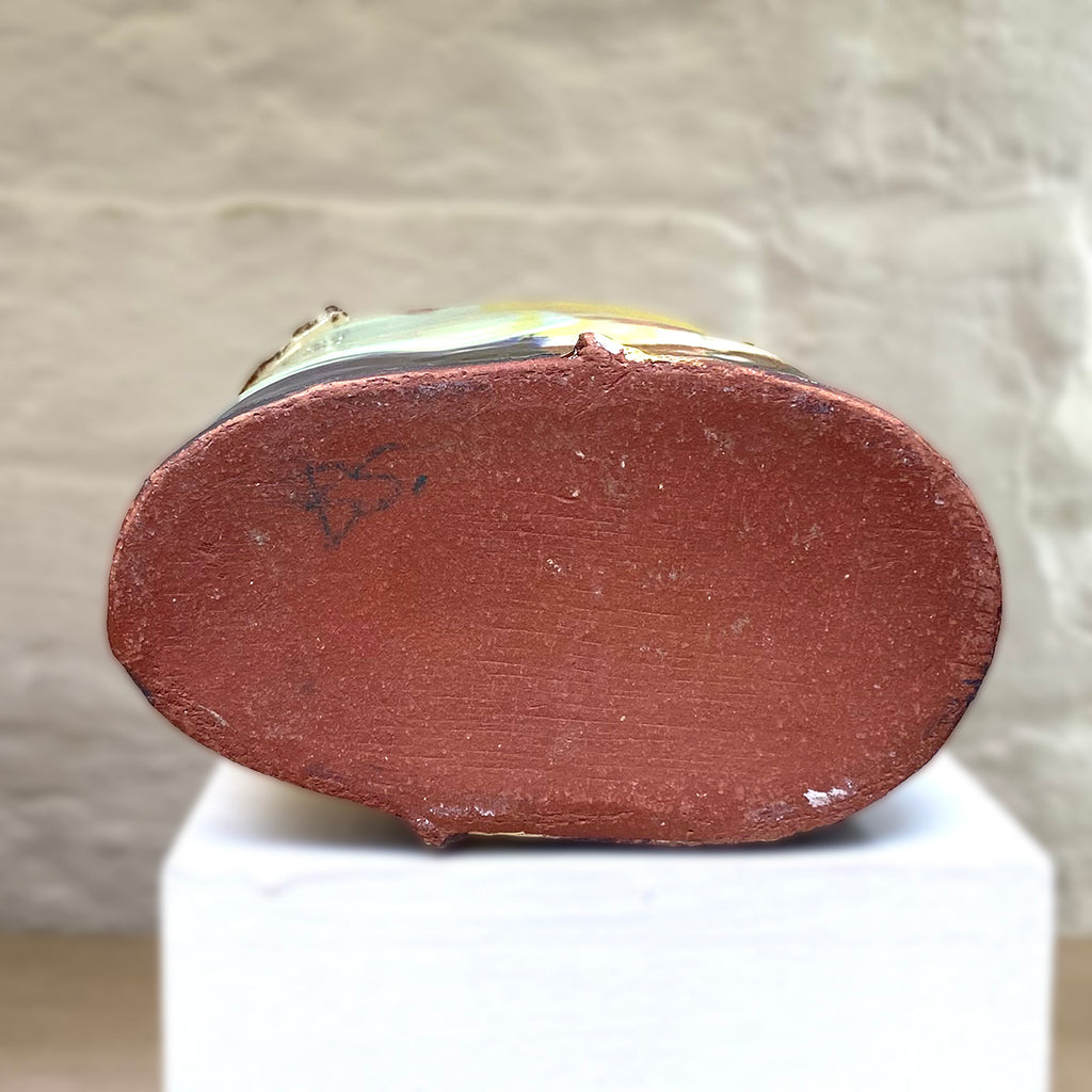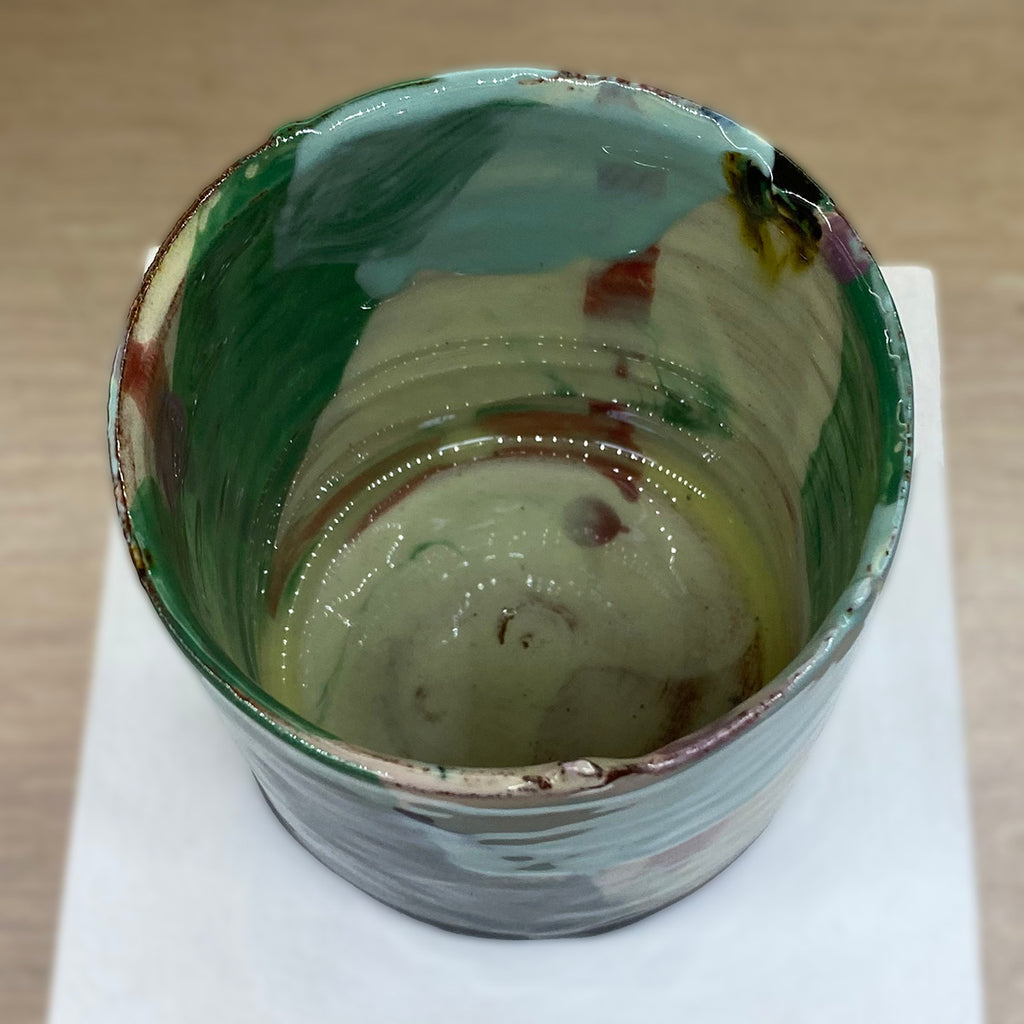 A wheel thrown red earthenware vessel, marked and altered, scored and handled, before being painted with layers of coloured slips and oxides. Washes of vivid colour are enhanced with a bright rich clear glaze.