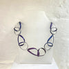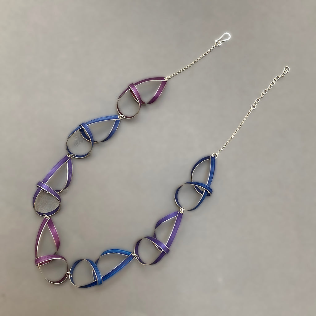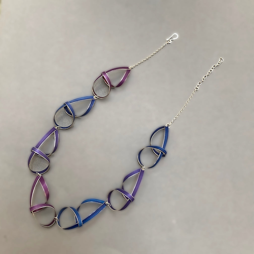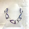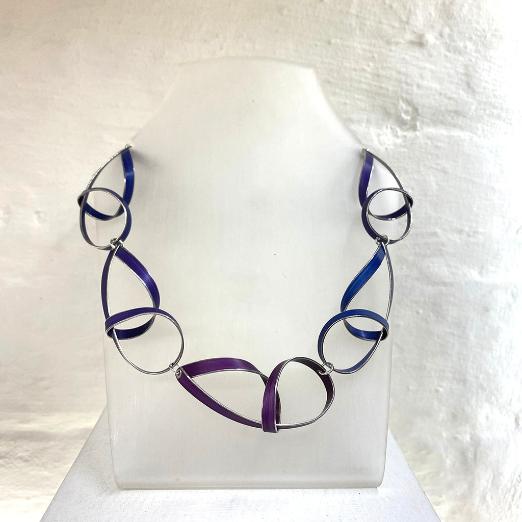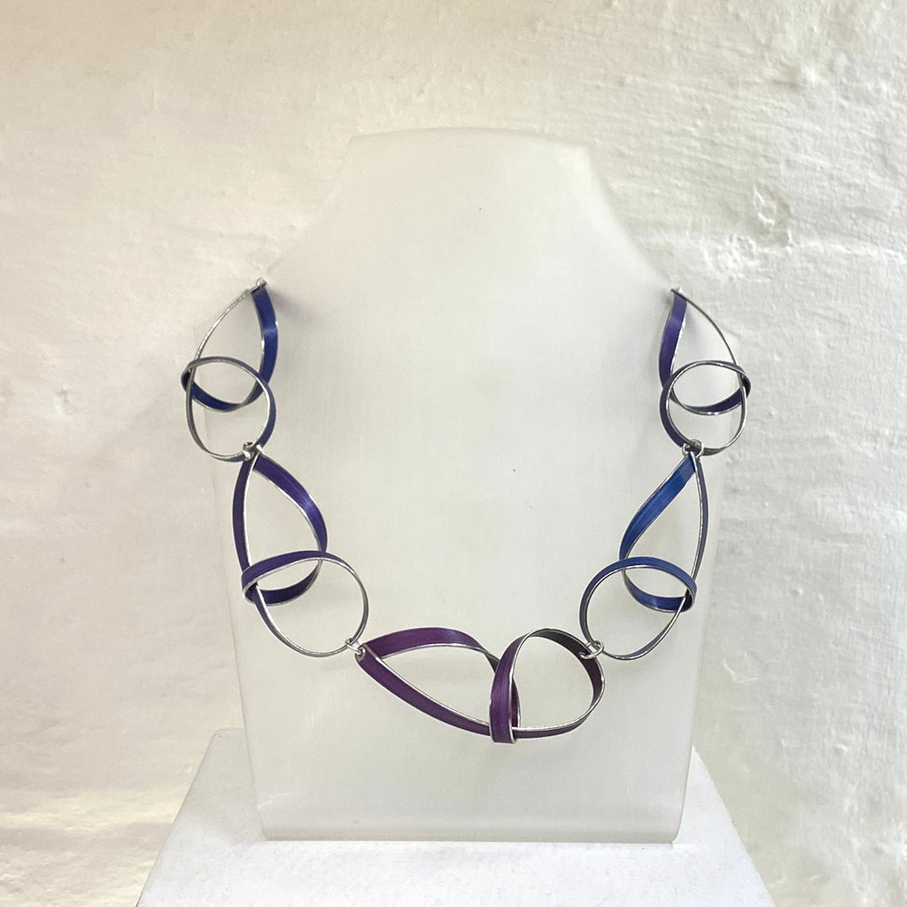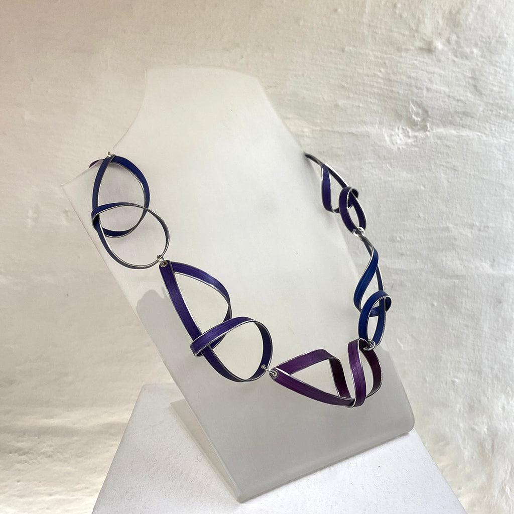 A beautiful statement necklace with a gradient of Purple, Indigo and Berry curly ribbons in lightweight hand-dyed aluminium.
