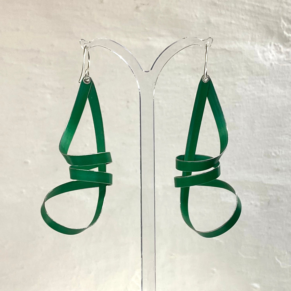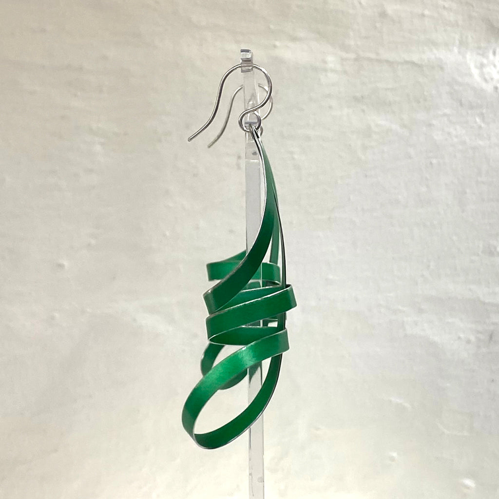 A beautiful pair of joyful green drop earrings, crafted from lightweight hand-dyed aluminium with a delicate double-twist design. Finished with a tube-riveted top and silver hooks, they make a perfect Christmas gift.