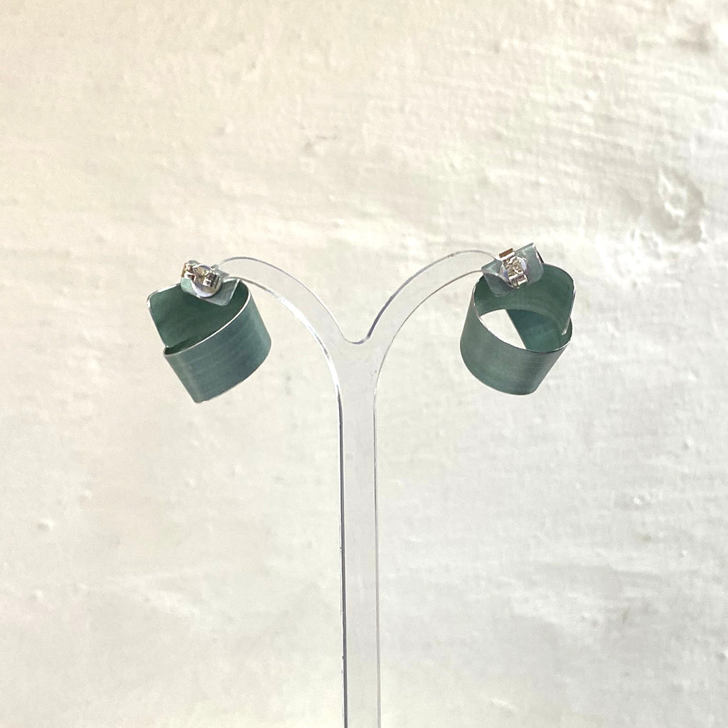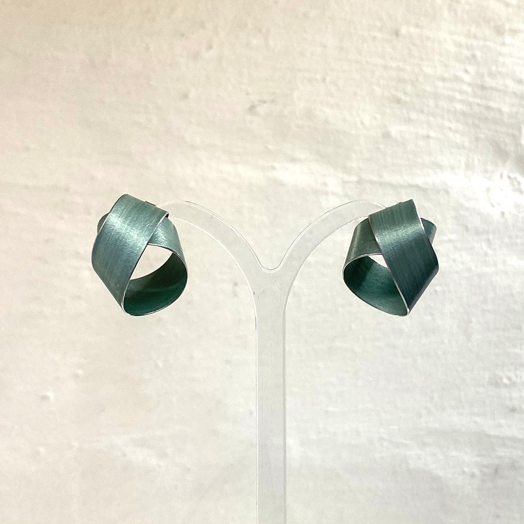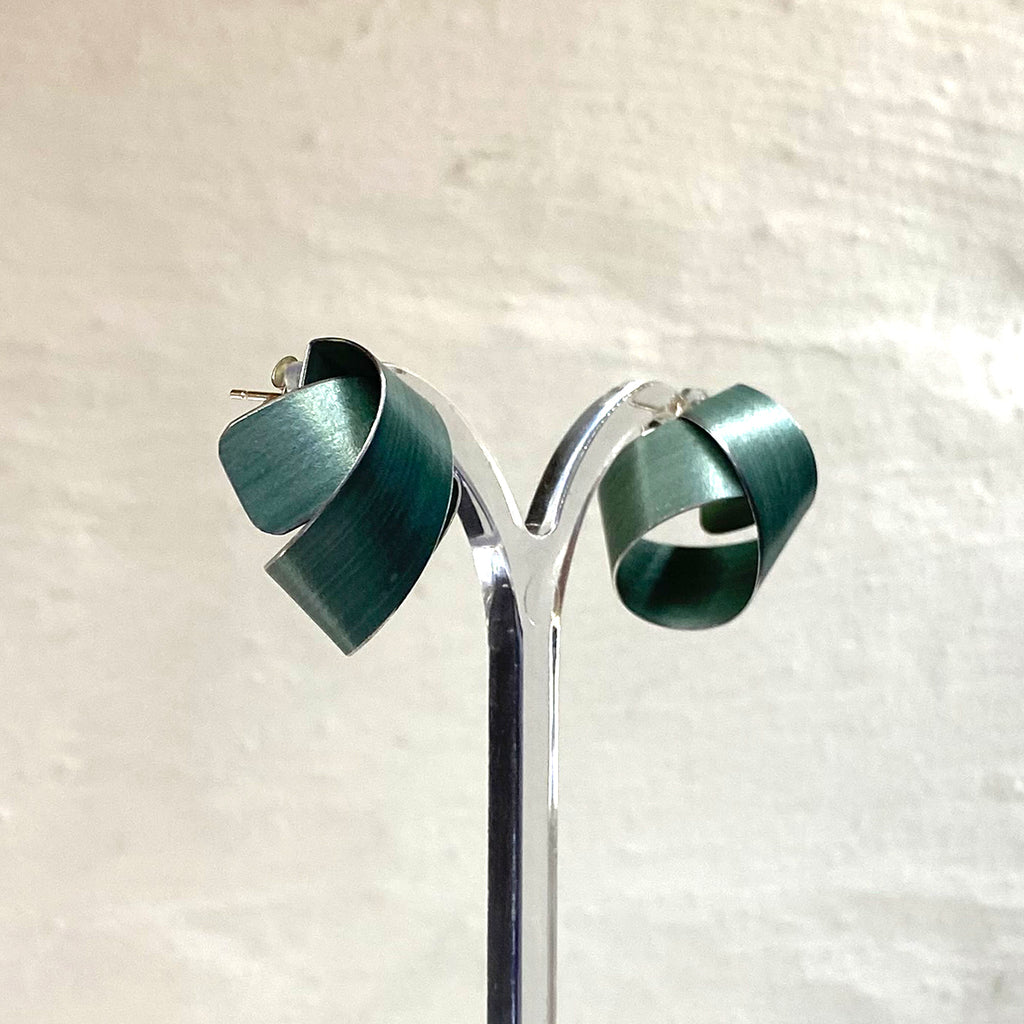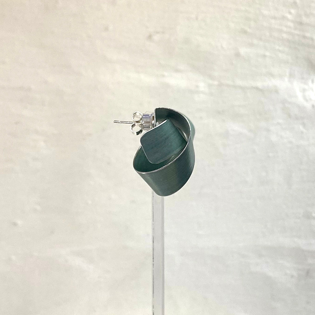 A beautiful pair of wide coil stud earrings in lightweight hand-dyed grey/blue tone aluminium.