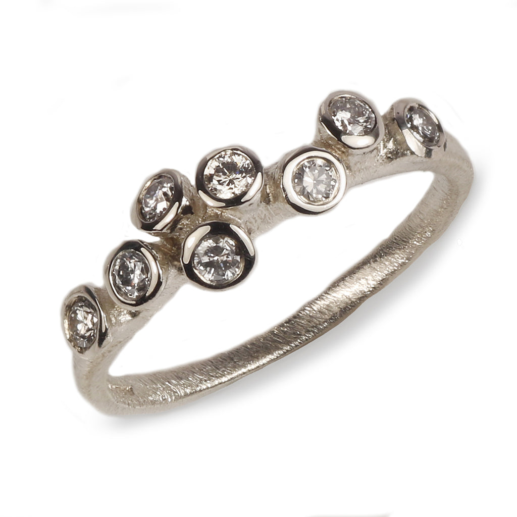 This beautiful engagement ring features eight brilliant cut diamonds in raised organic settings in etched 9ct white gold.