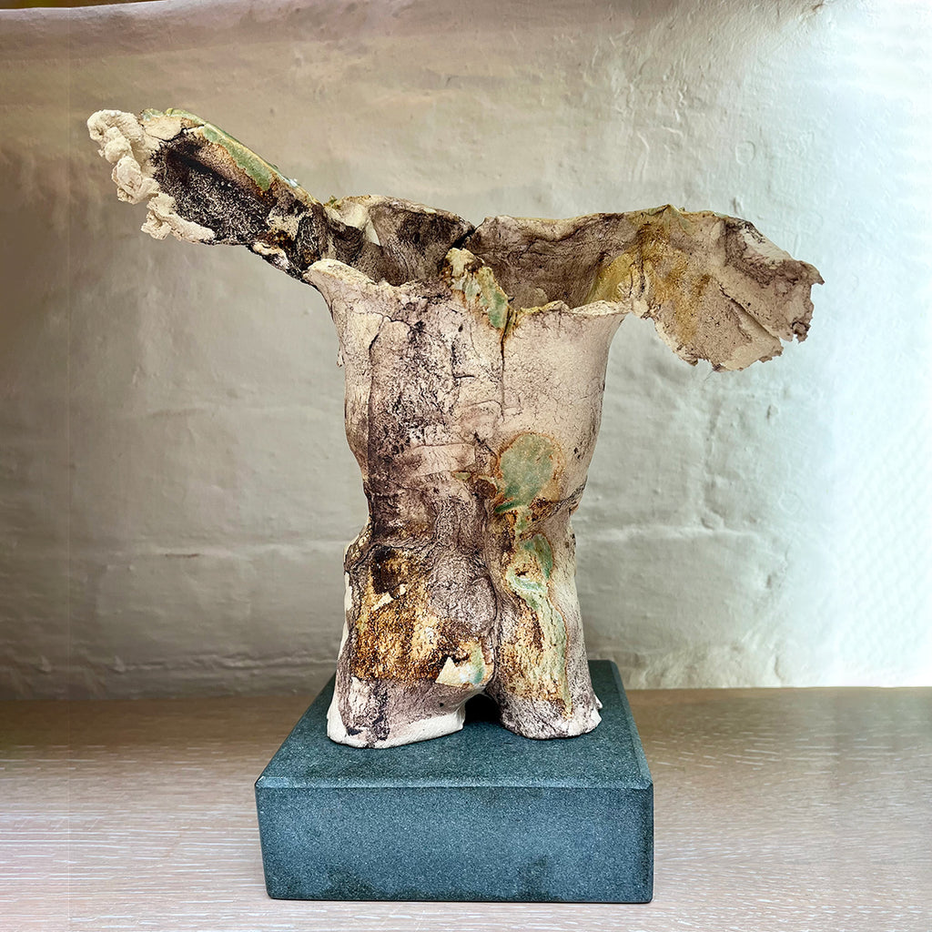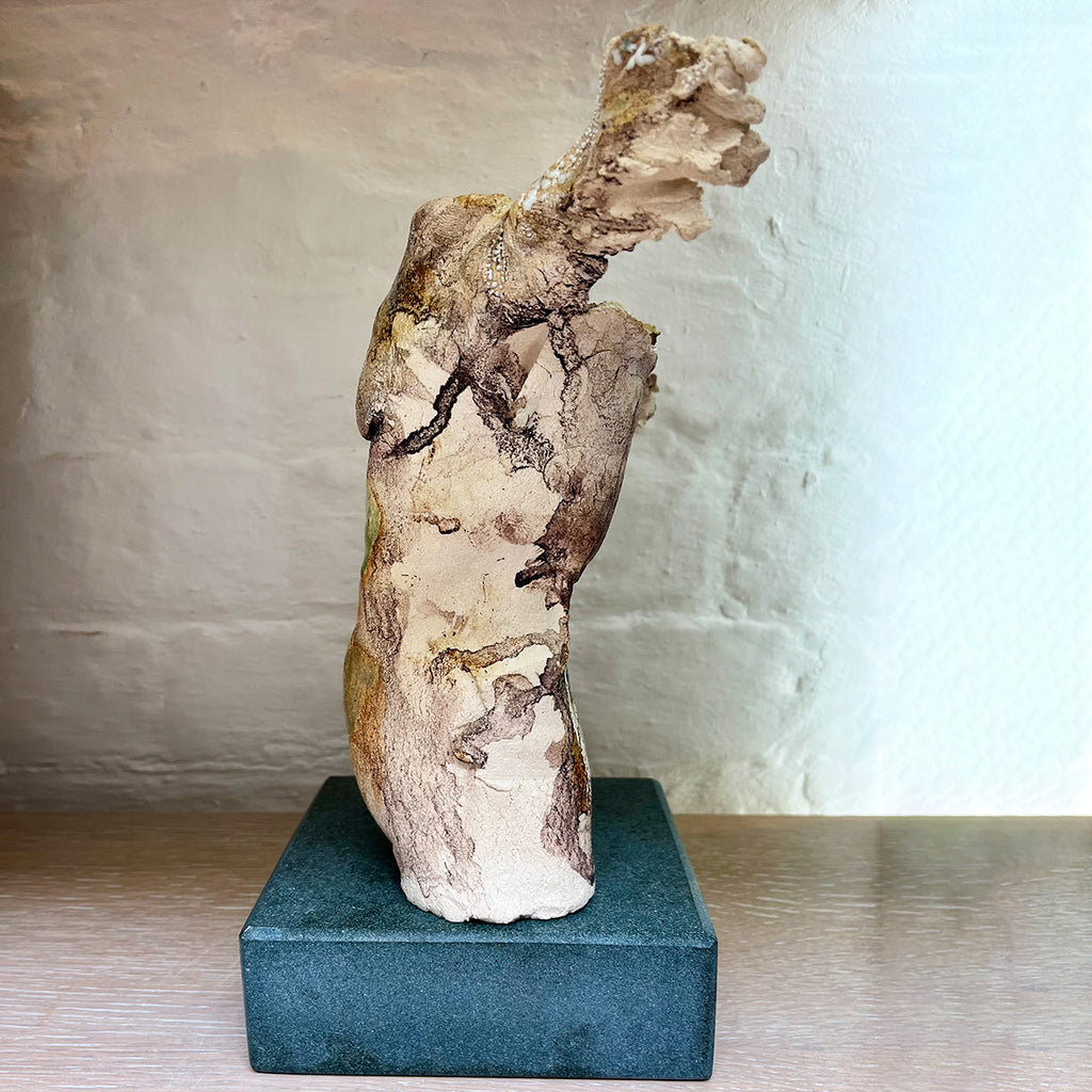 Winged male torso sculpted from porcelain with oxides and celadon glaze. Part of the 'Stagnation of the Soul' series. Stands on a slate plinth.