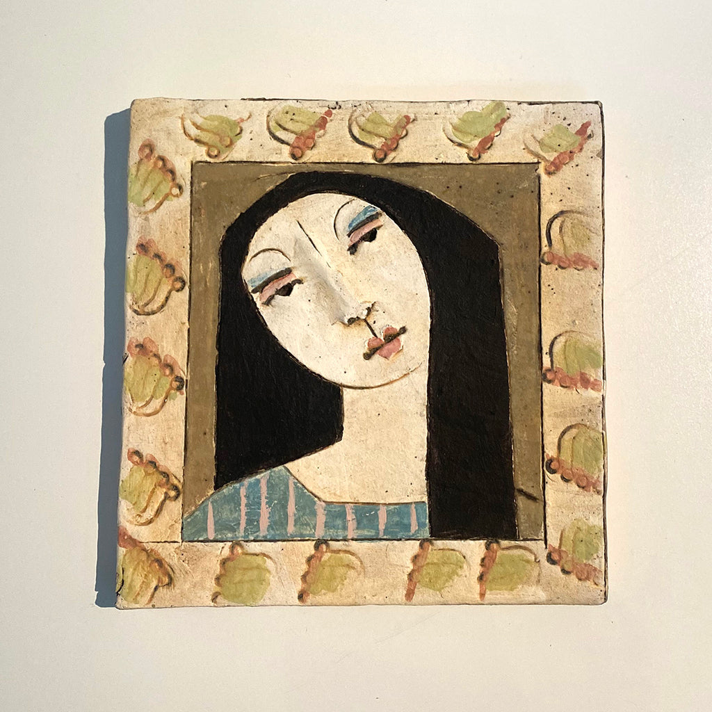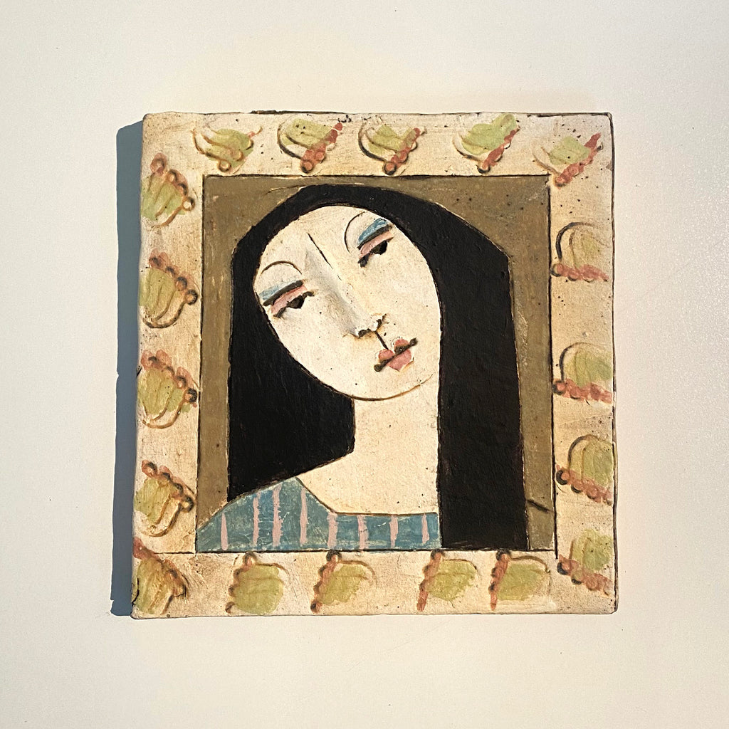 A ceramic tile by Christy Keeney featuring an arresting portrait of a dark haired woman.