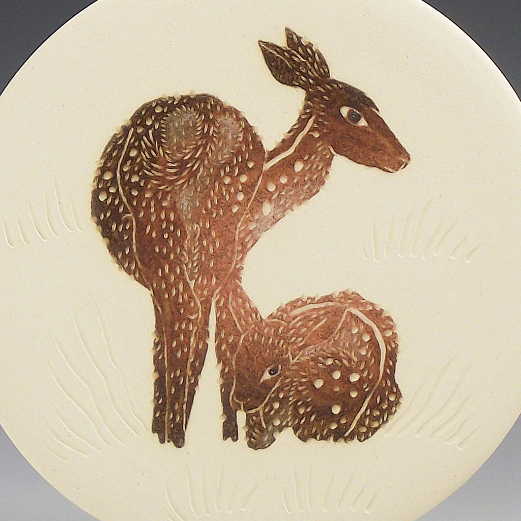 Only the deer have been glazed, giving them a lovely shimmer while leaving the rest of the decoration matte. Once completed the piece is left to dry for a few weeks and fired twice in an electric kiln.
