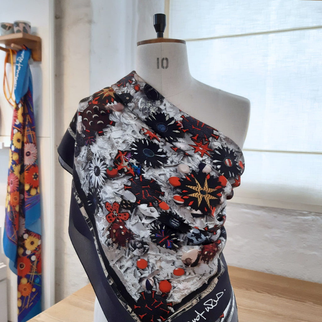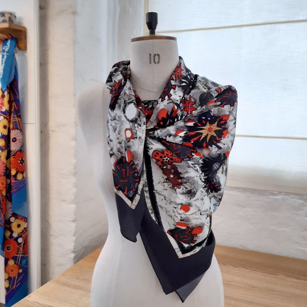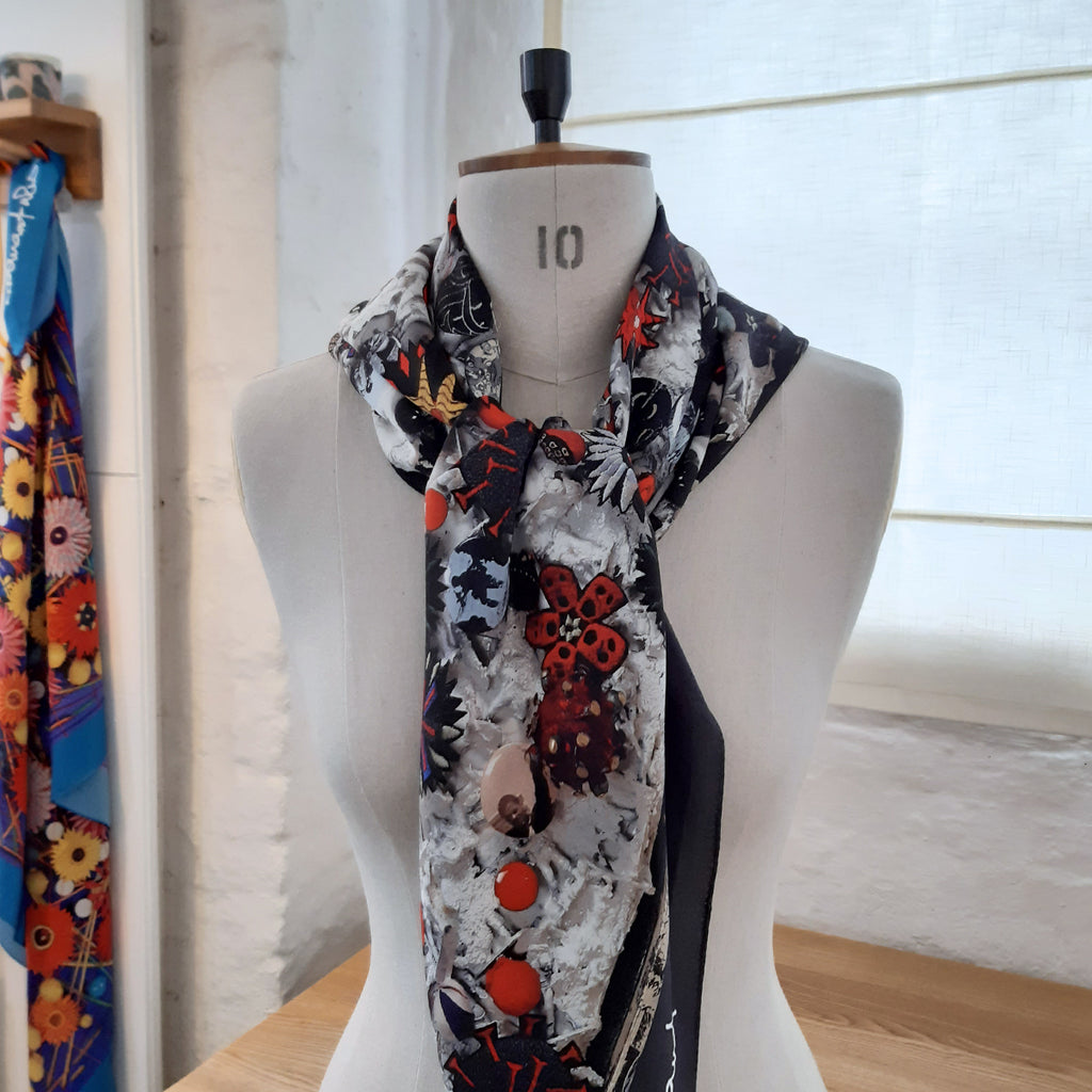 A stunning statement silk scarf featuring a printed design based on Michael's constructed textile artwork, 'Pretty Deadly'.